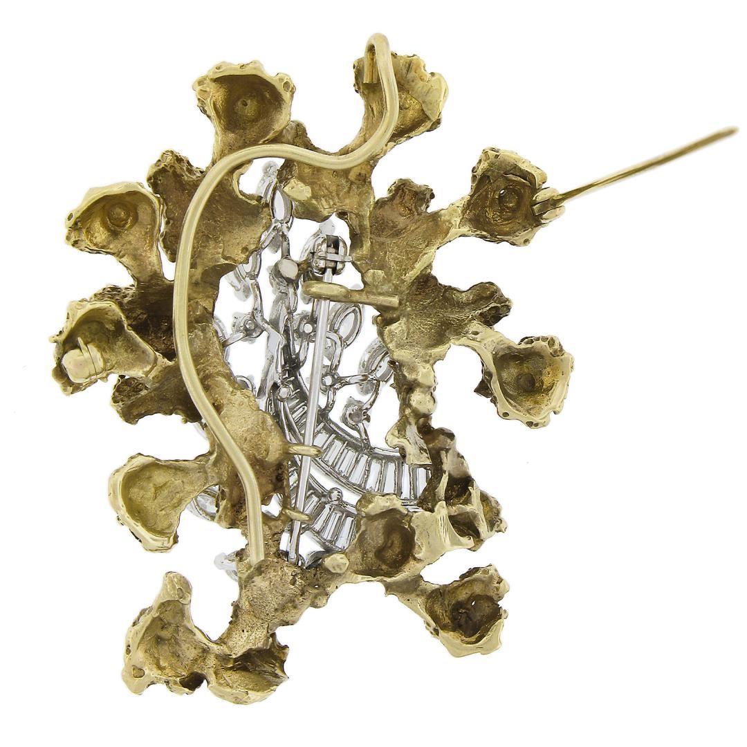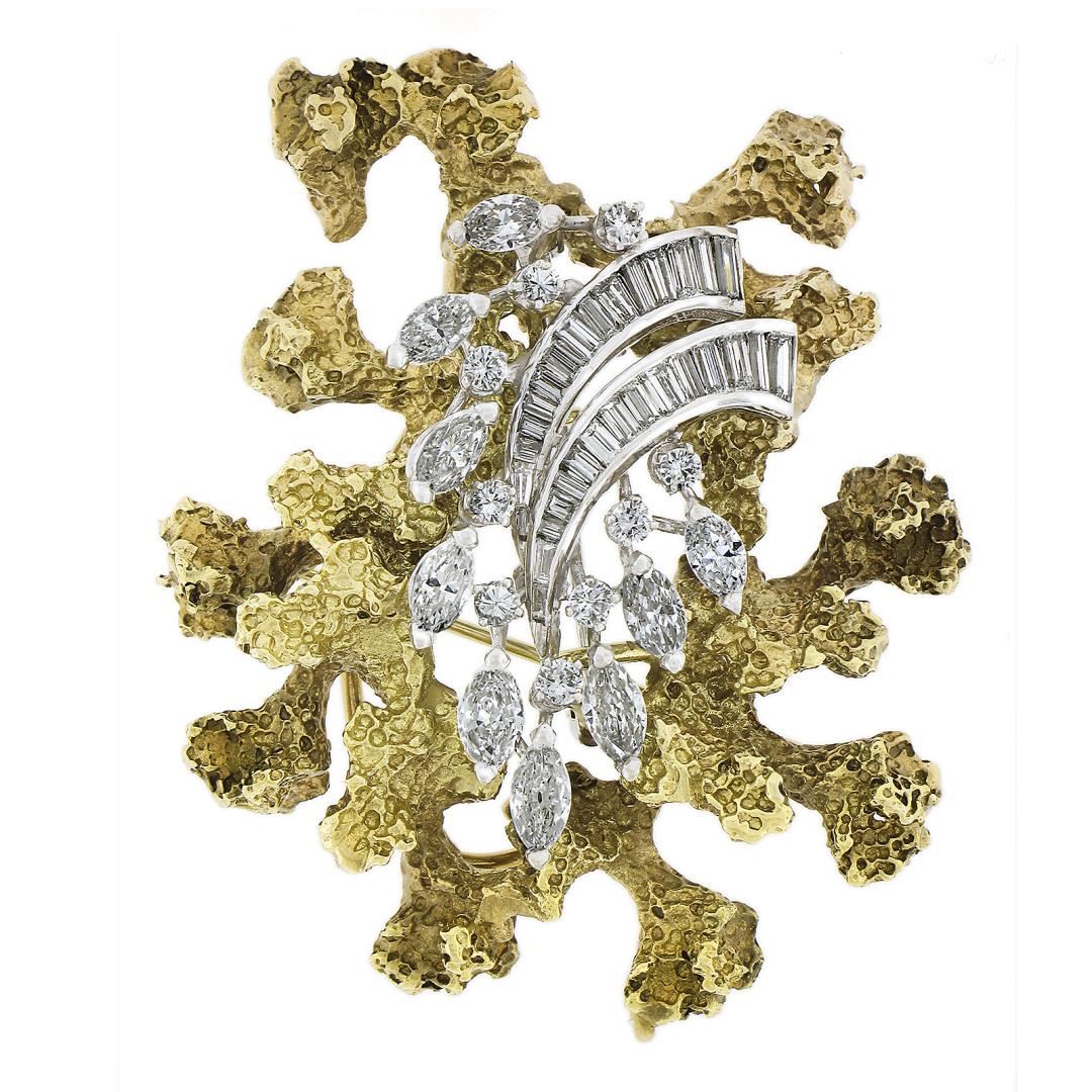 A vintage solid 14k yellow & white gold brooch, featuring 9 marquise cut, 9 round cut, 30 bageutte cut natural diamonds (G-I - VS1-SI1 ; 3.50ctw), and Measures 42.5x54.9mm and weighs a total of 24.14 grams.