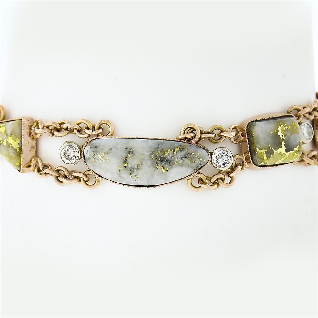 A solid 14k yellow & white gold link bracelet, with 7 Various cabochon shape natural golden quartz (20.25x7.50mm), and 6 round brilliant cut natural diamonds (G/H - VS2/SI2 ; 0.72ctw). It weighs a total of 18.86 grams, measures 14.95mm wide, and measures
