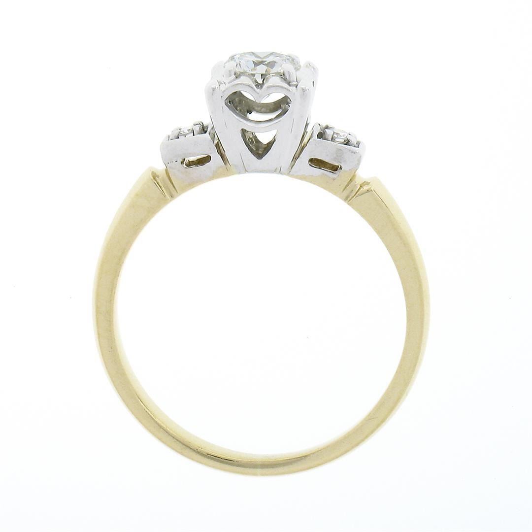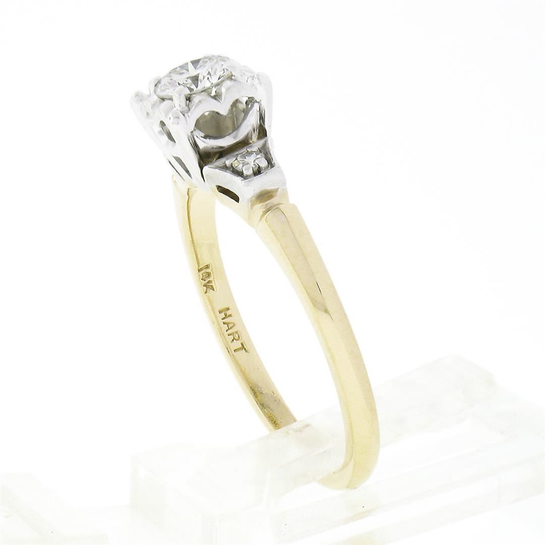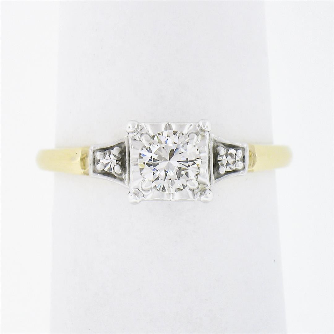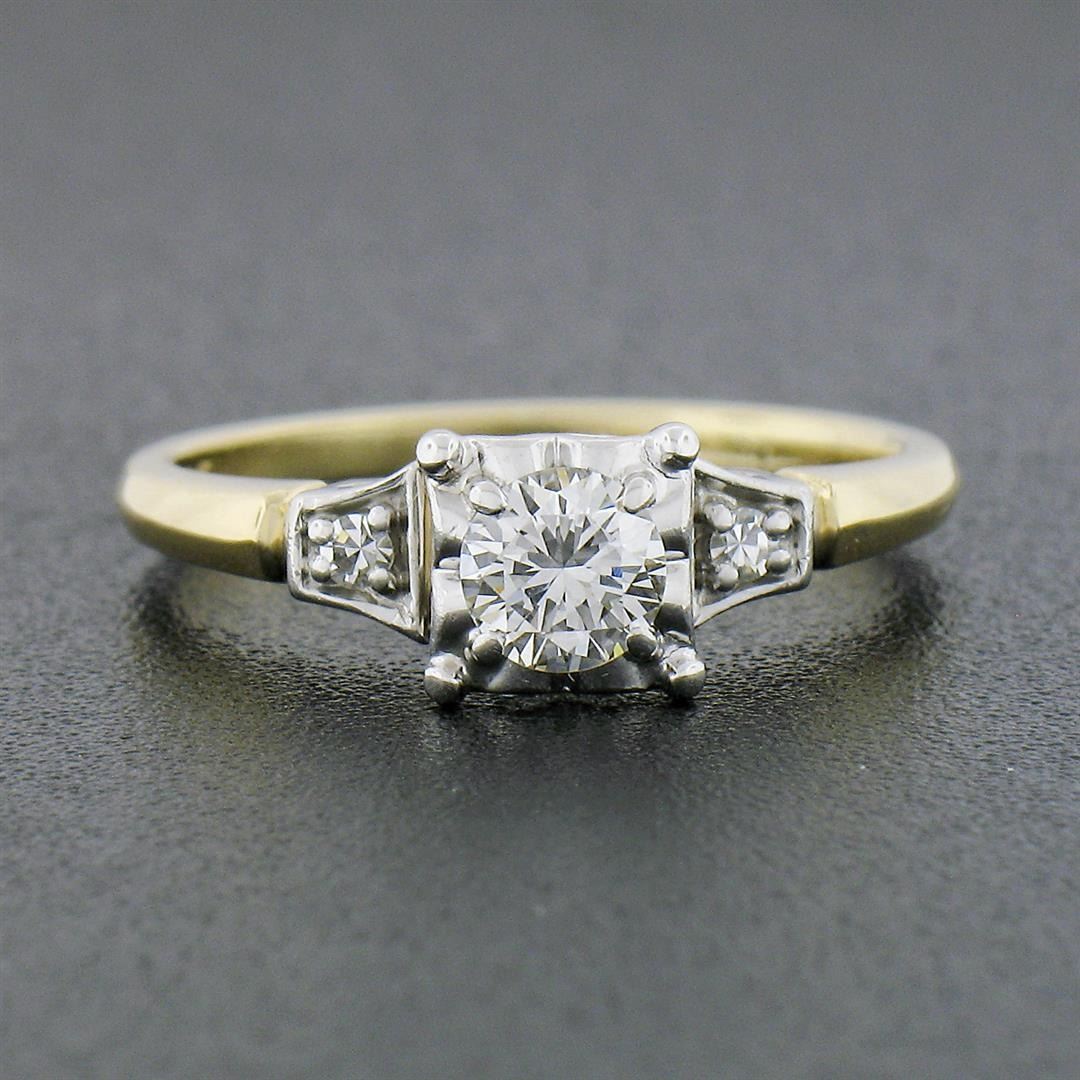 A vintage solid 14k yellow & white gold engagement ring, featuring 1 round brilliant cut natural diamond (G - VVS2 ; 0.30ct ), accented with 2 single cut natural diamonds (G - VVS2 ; 0.06ctw). The ring is size 5.5, weighs a total of 2.50 grams, and measures 5.85mm wide.