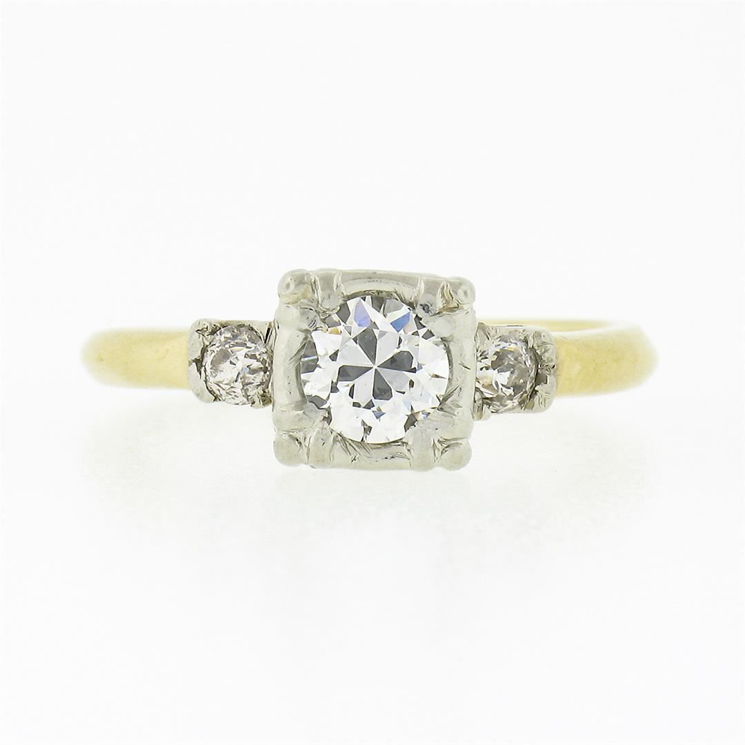 A solid 14k yellow & white gold engagement ring, with 3 old cut natural diamonds (H/I - VS2/SI1 ; 0.68ctw). The ring is size 6.5, weighs a total of 2.78 grams, and measures 6.80mm wide.