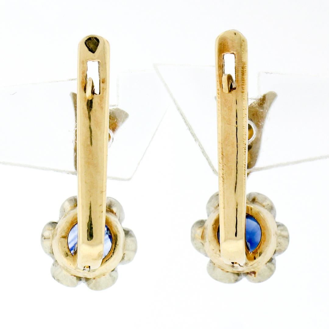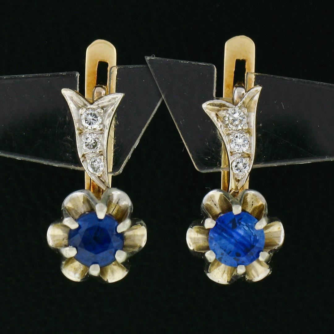 A vintage solid 14k yellow & white gold flower drop earrings, featuring 2 round cut natural sapphires (1.00ctw), and 6 round transitional cut natural diamonds (H/I - VS1/VS2 ; 0.12ctw ). The earrings measure approximately 16.46x8.25mm and weigh a total of 4.85 grams.