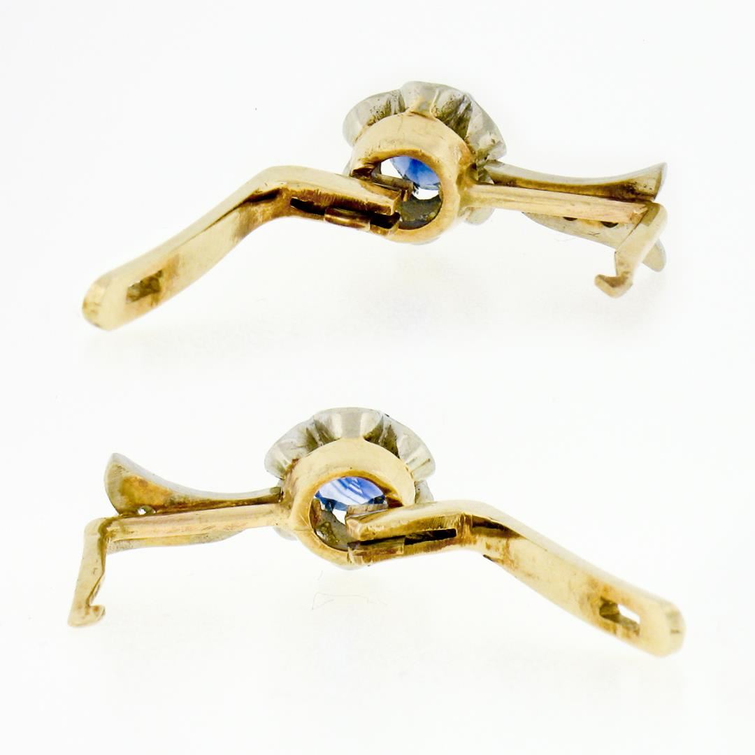 A vintage solid 14k yellow & white gold flower drop earrings, featuring 2 round cut natural sapphires (1.00ctw), and 6 round transitional cut natural diamonds (H/I - VS1/VS2 ; 0.12ctw ). The earrings measure approximately 16.46x8.25mm and weigh a total of 4.85 grams.