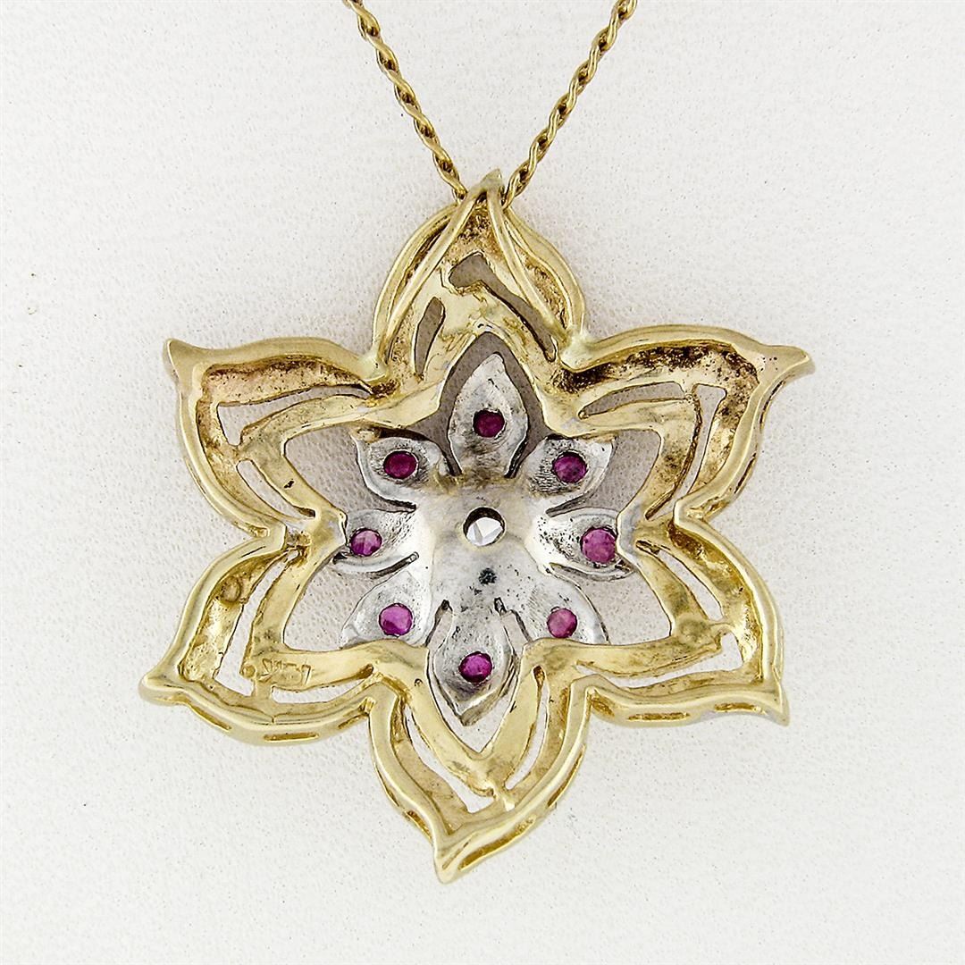 A solid 14k two tone gold pendant necklace, with 1 round brilliant cut natural diamond (H - VS1 ; 5.11mm - 0.50ct), surrounded with a halo of 8 old round cut natural rubies (1.55mm ; 0.16ctw). 20.75 inch curb link chain, 9.75 grams total weight, pendant measures 32.15x28.28mm.