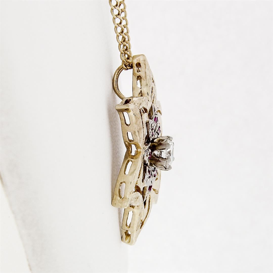 A solid 14k two tone gold pendant necklace, with 1 round brilliant cut natural diamond (H - VS1 ; 5.11mm - 0.50ct), surrounded with a halo of 8 old round cut natural rubies (1.55mm ; 0.16ctw). 20.75 inch curb link chain, 9.75 grams total weight, pendant measures 32.15x28.28mm.