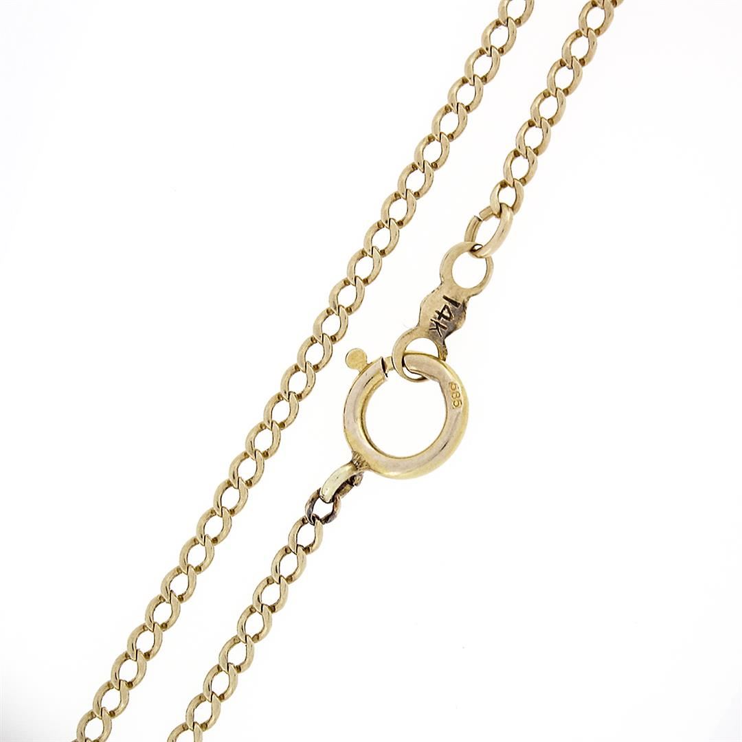 A solid 14k two tone gold pendant necklace, with 1 round brilliant cut natural diamond (H - VS1 ; 5.11mm - 0.50ct), surrounded with a halo of 8 old round cut natural rubies (1.55mm ; 0.16ctw). 20.75 inch curb link chain, 9.75 grams total weight, pendant measures 32.15x28.28mm.