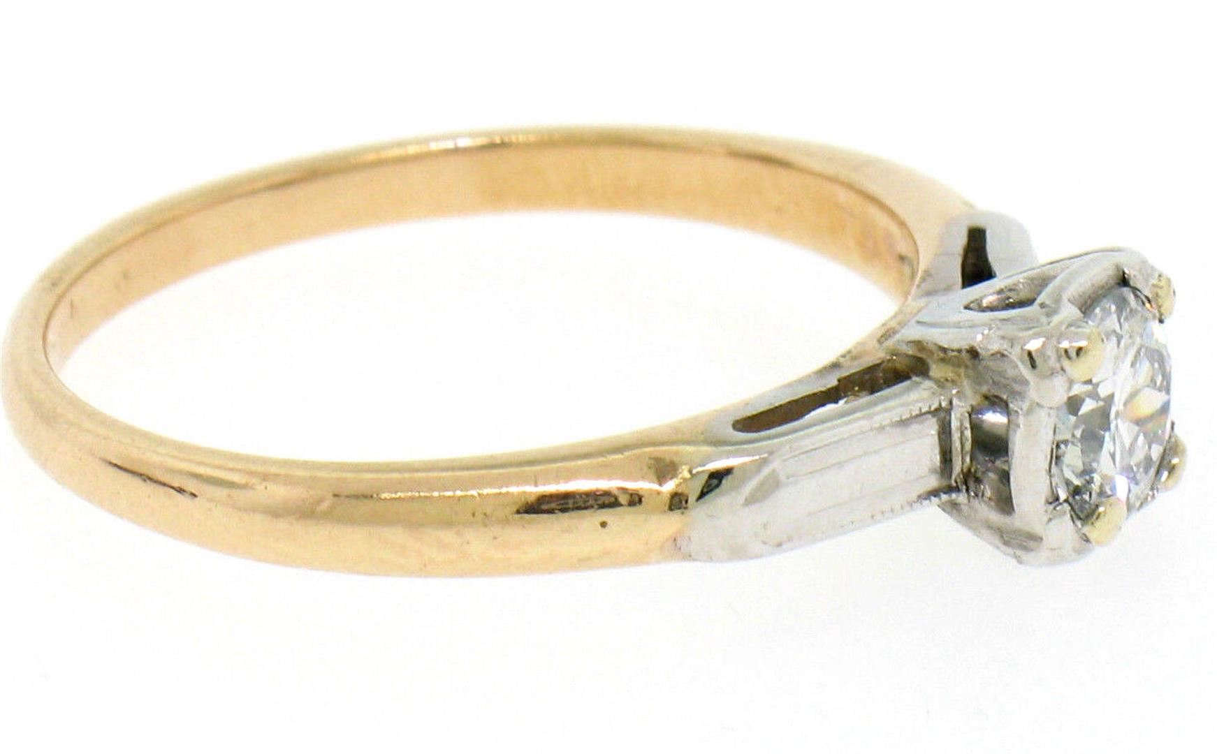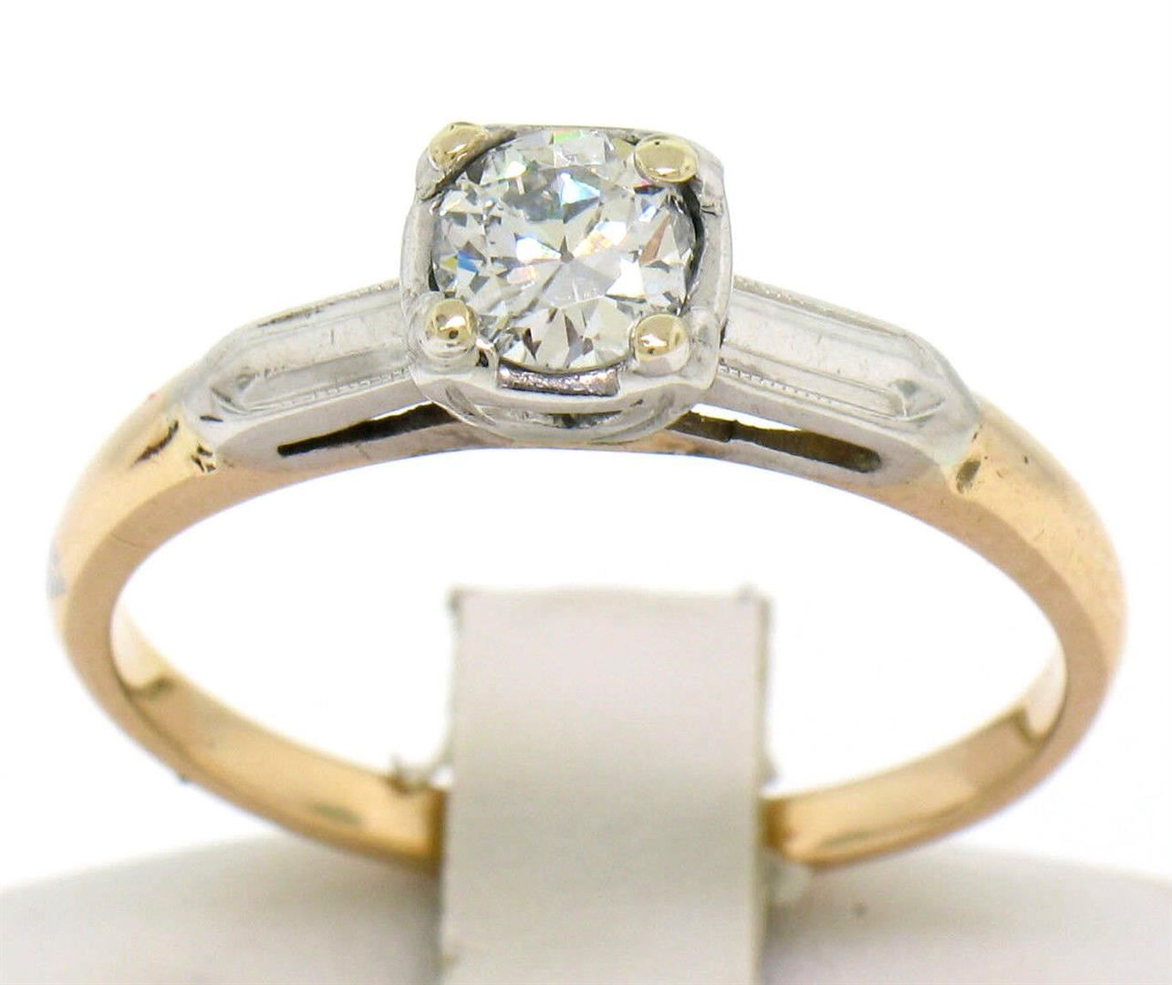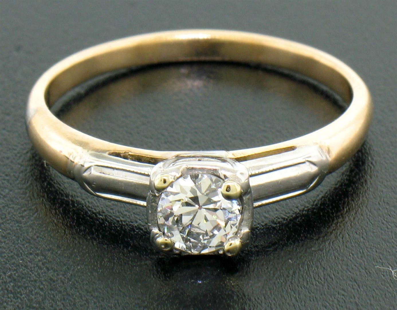 A vintage solid 14k yellow and white gold solitaire ring, featuring 1 old european cut natural diamond (G- VS2; 0.53ct). The ring is size 8.25, weighs a total of 3.1 grams, and measures 6.21mm wide.