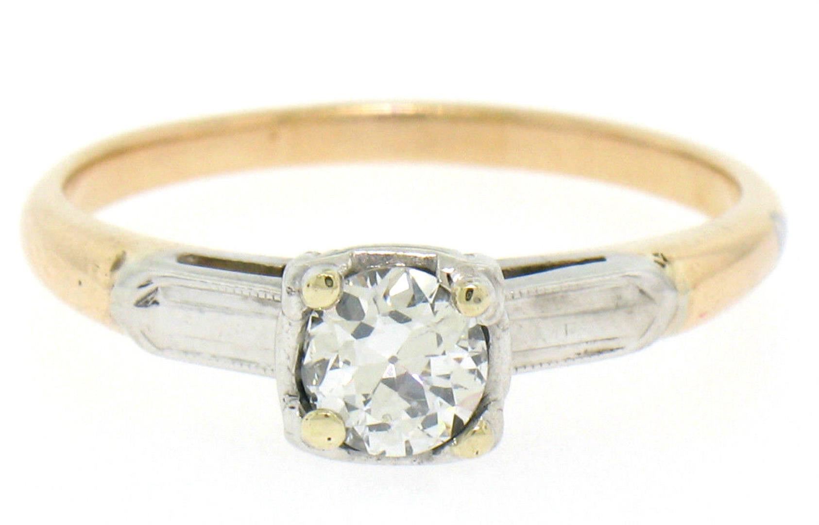 A vintage solid 14k yellow and white gold solitaire ring, featuring 1 old european cut natural diamond (G- VS2; 0.53ct). The ring is size 8.25, weighs a total of 3.1 grams, and measures 6.21mm wide.