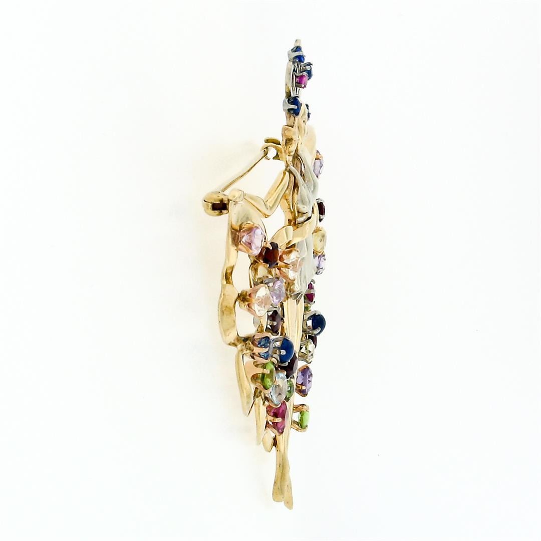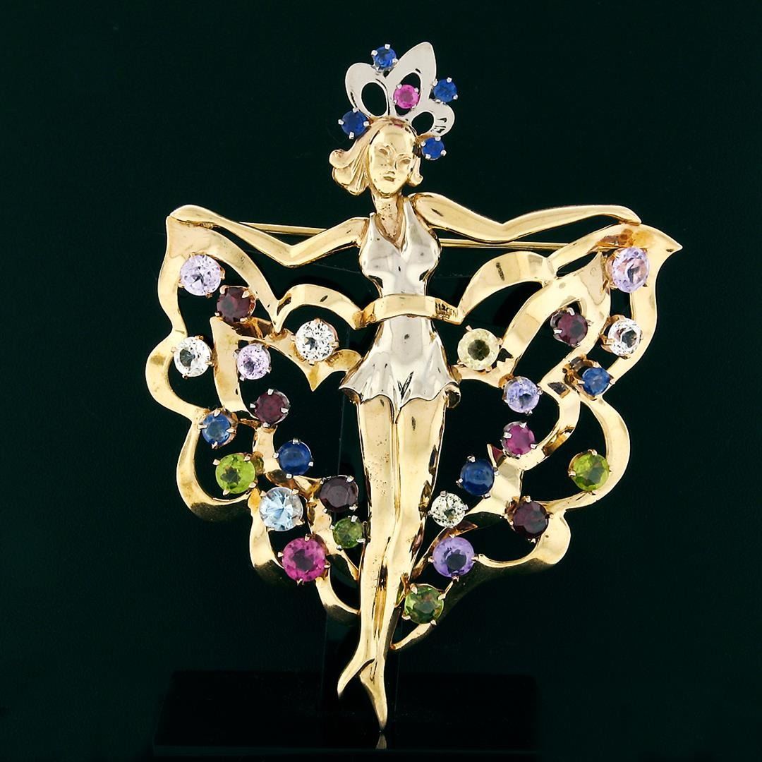 A solid 14k two tone gold ballerina dancing woman brooch, with 31 round cut mutli stones (2.48mm to 4.90mm). Measures 75.82x59mm and weighs a total of 26.84 grams.