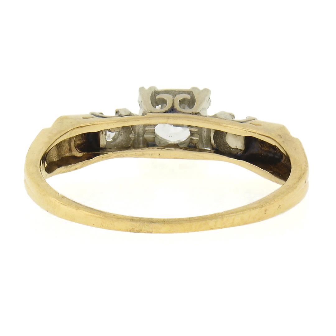 A vintage solid 14k yellow & white gold solitaire engagement ring, with 1 old european cut natural diamond (H - VS2 ; 0.26ct ), & 2 old single cut natural diamonds (G/H  - VS2/SI1 ; 0.01ctw). . The ring is size 6.5, weighs a total of 2.23 grams, and measures 5mm wide.