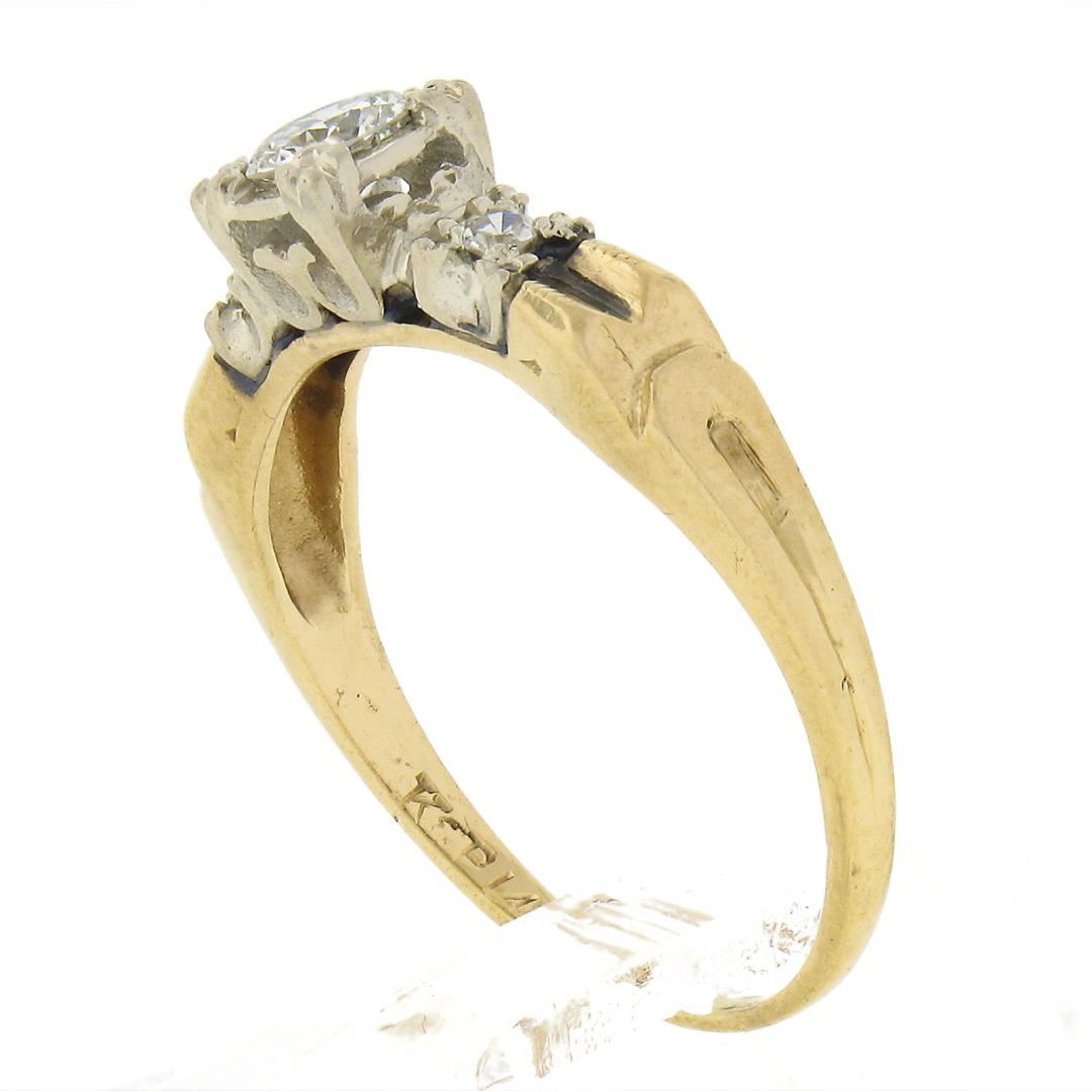 A vintage solid 14k yellow & white gold solitaire engagement ring, with 1 old european cut natural diamond (H - VS2 ; 0.26ct ), & 2 old single cut natural diamonds (G/H - VS2/SI1 ; 0.01ctw). . The ring is size 6.5, weighs a total of 2.23 grams, and measures 5mm wide.