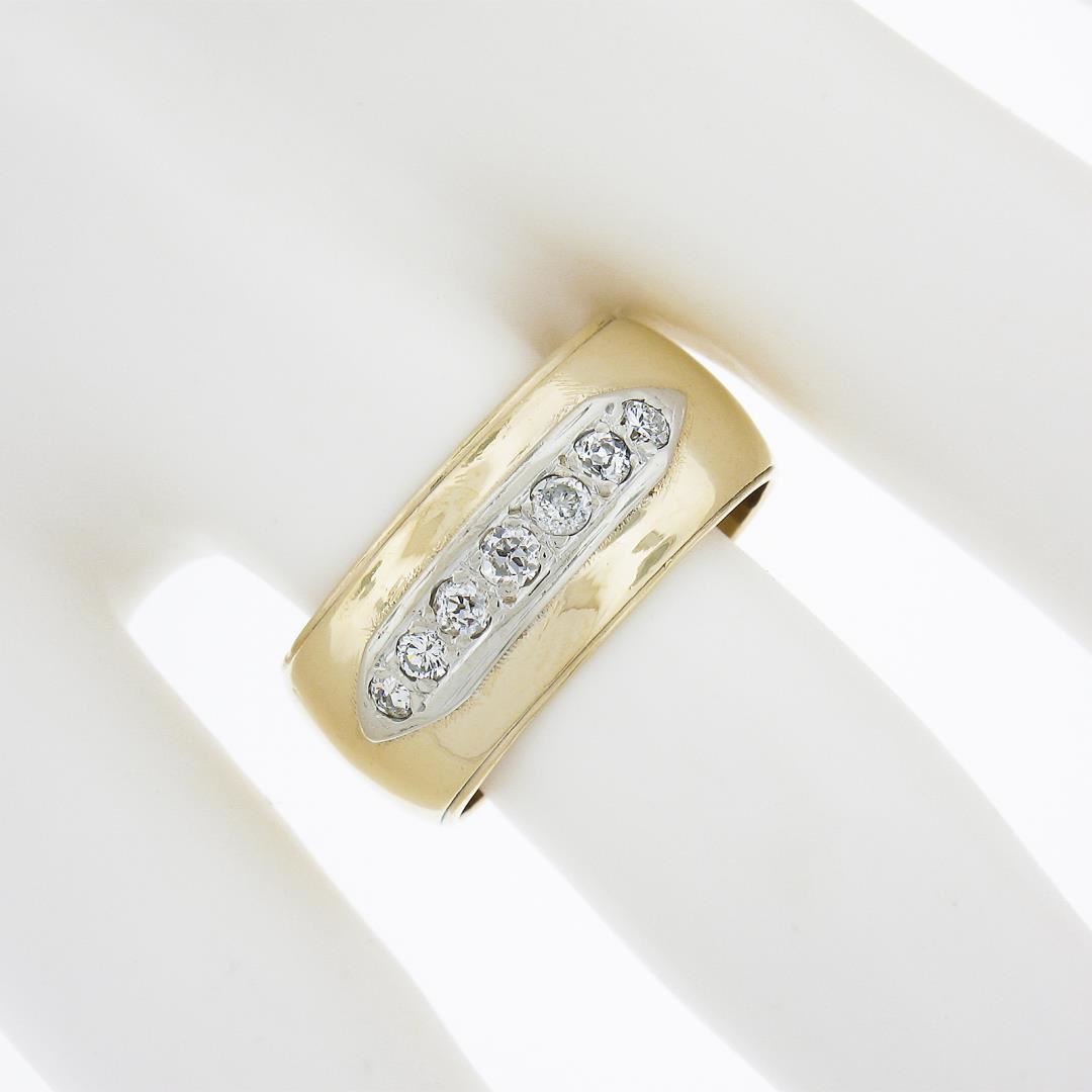 A vintage solid 14k yellow & whit gold band ring, with 7 round cut natural diamonds (G-I - VS2-SI2 ; 0.25ctw). The ring is size 7.0, weighs a total of 8.92 grams, and measures 9.3mm wide.