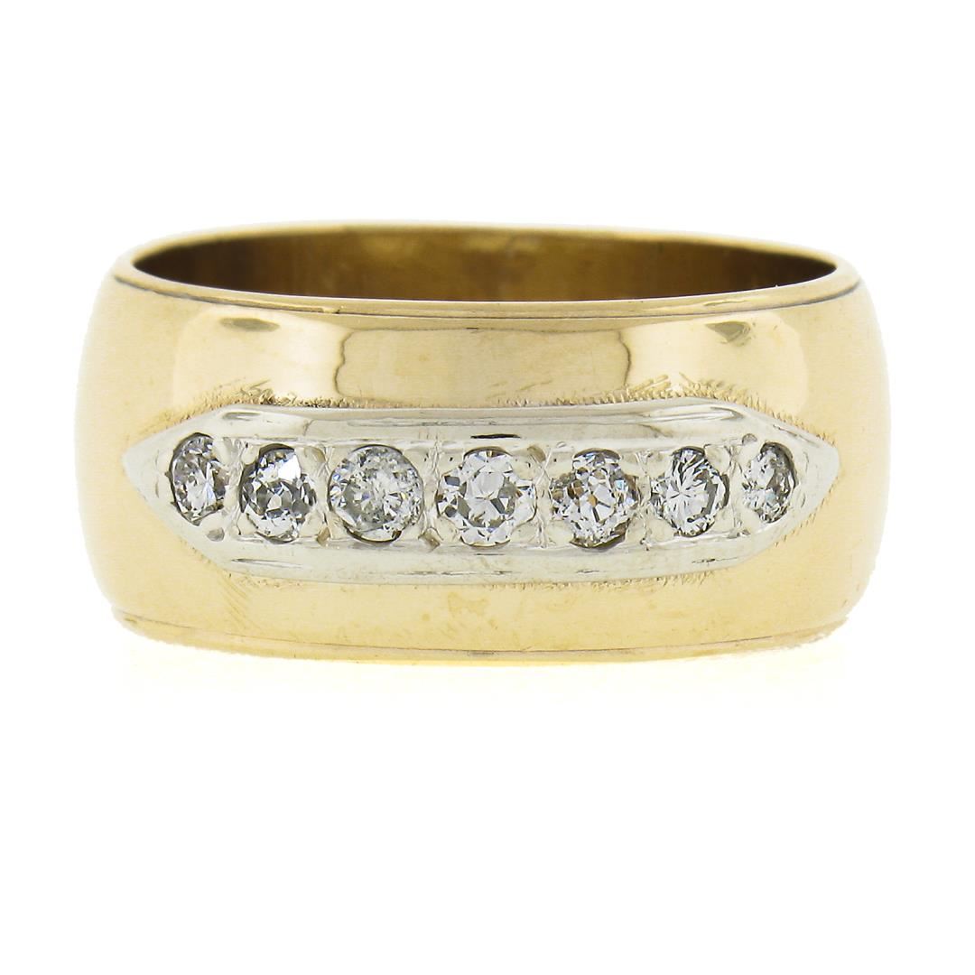 A vintage solid 14k yellow & whit gold band ring, with 7 round cut natural diamonds (G-I - VS2-SI2 ; 0.25ctw). The ring is size 7.0, weighs a total of 8.92 grams, and measures 9.3mm wide.