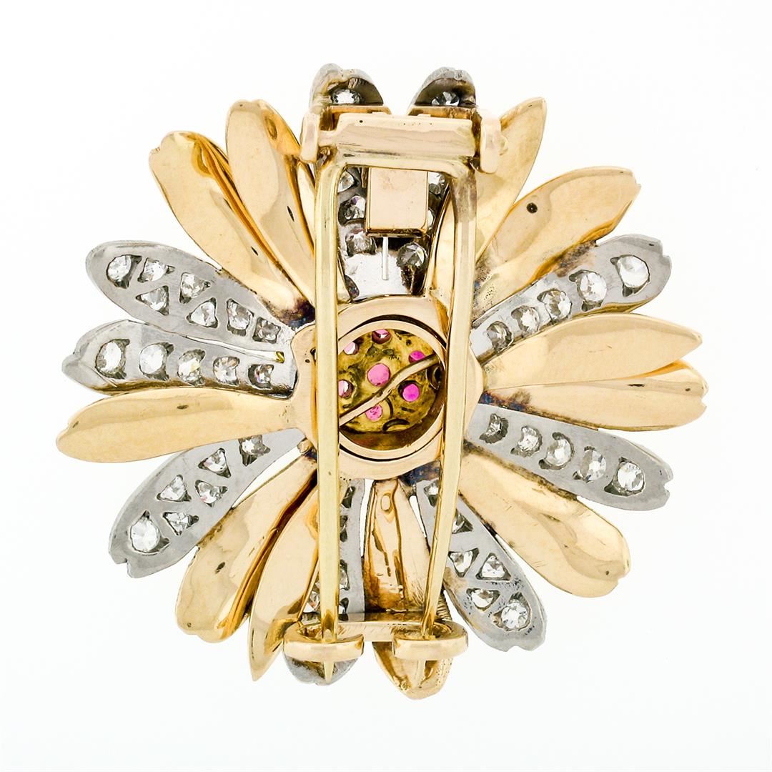 A vintage solid 14k yellow & white gold flower pin brooch, with 17 round cut natural rubies (0.55ctw), and 53 old european and single cut natural diamonds (G/H - VS1-SI1 ; 1.0ctw). Measures 34.5x33.8mm and weighs a total of 12.63 grams.