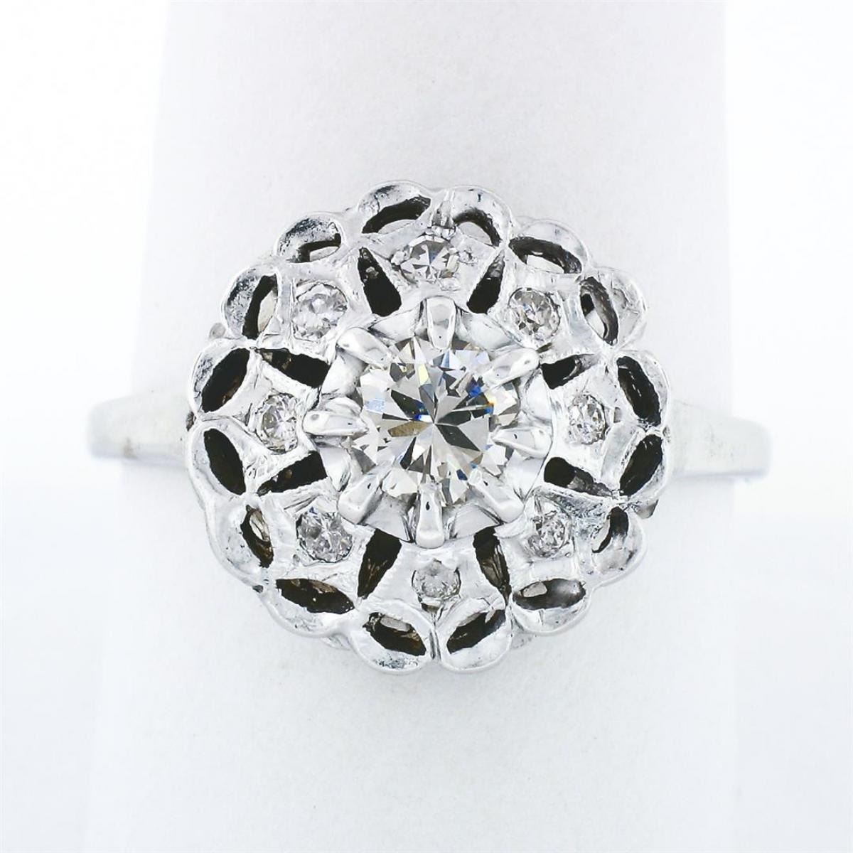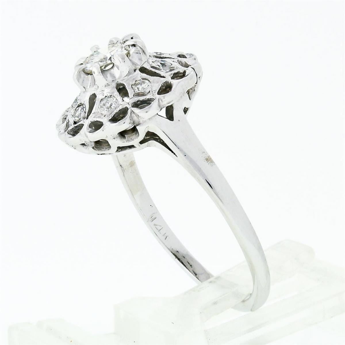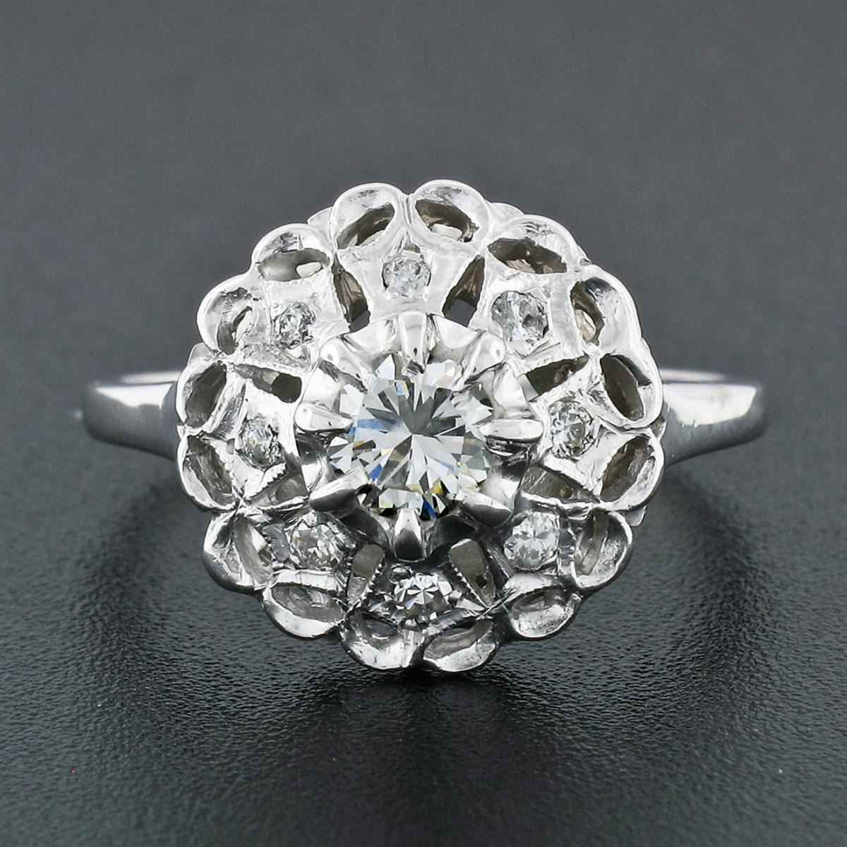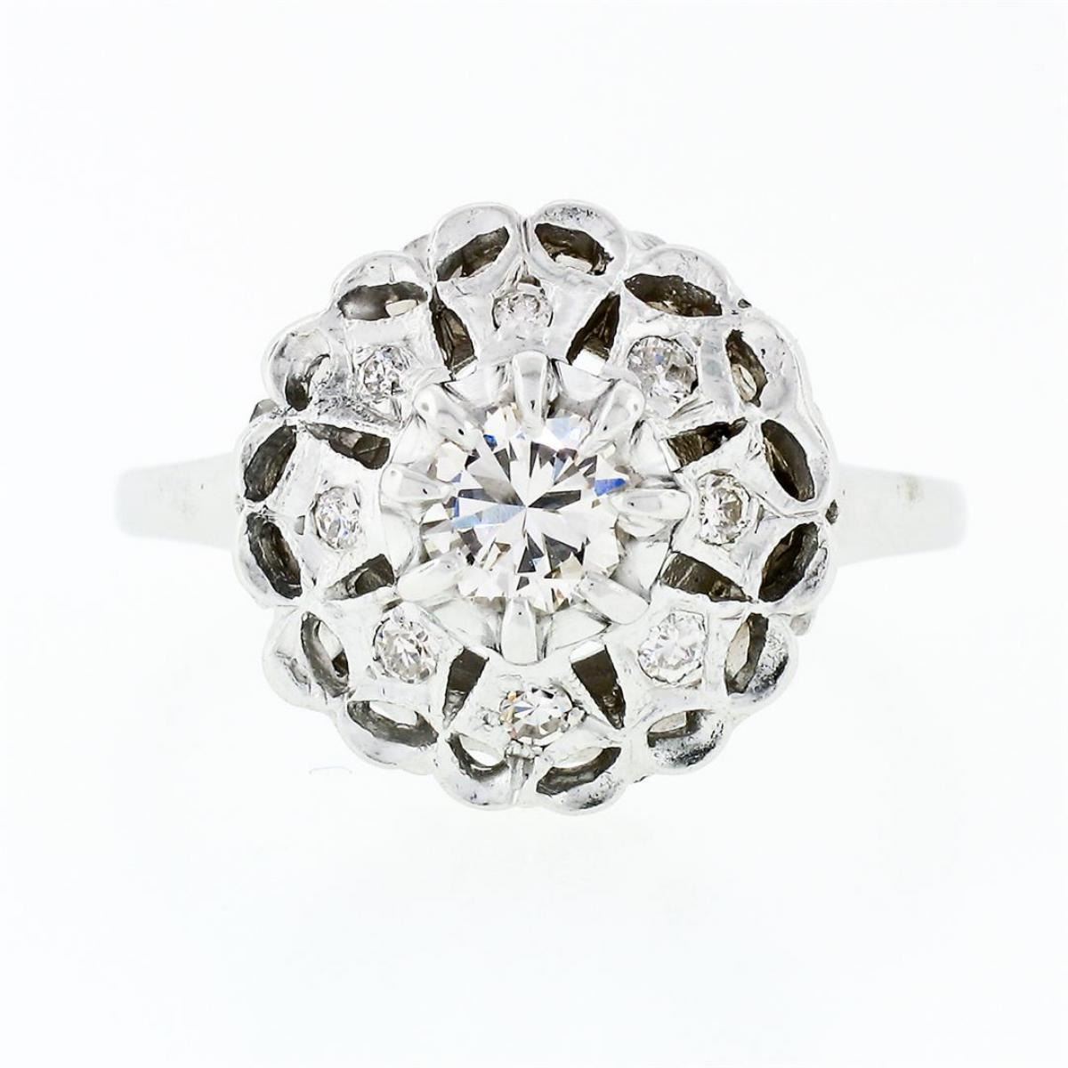 A vintage solid 14k white gold platter cluster ring with 1 round transitional cut natural diamond (J - VS1; 0.52ct) surrounded by 8 old round cut natural diamonds (H/I - VS1 to SI2; 0.18ctw). The ring is size 10.0, weighs a total of 4.93 grams, and measures 14.99mm wide.