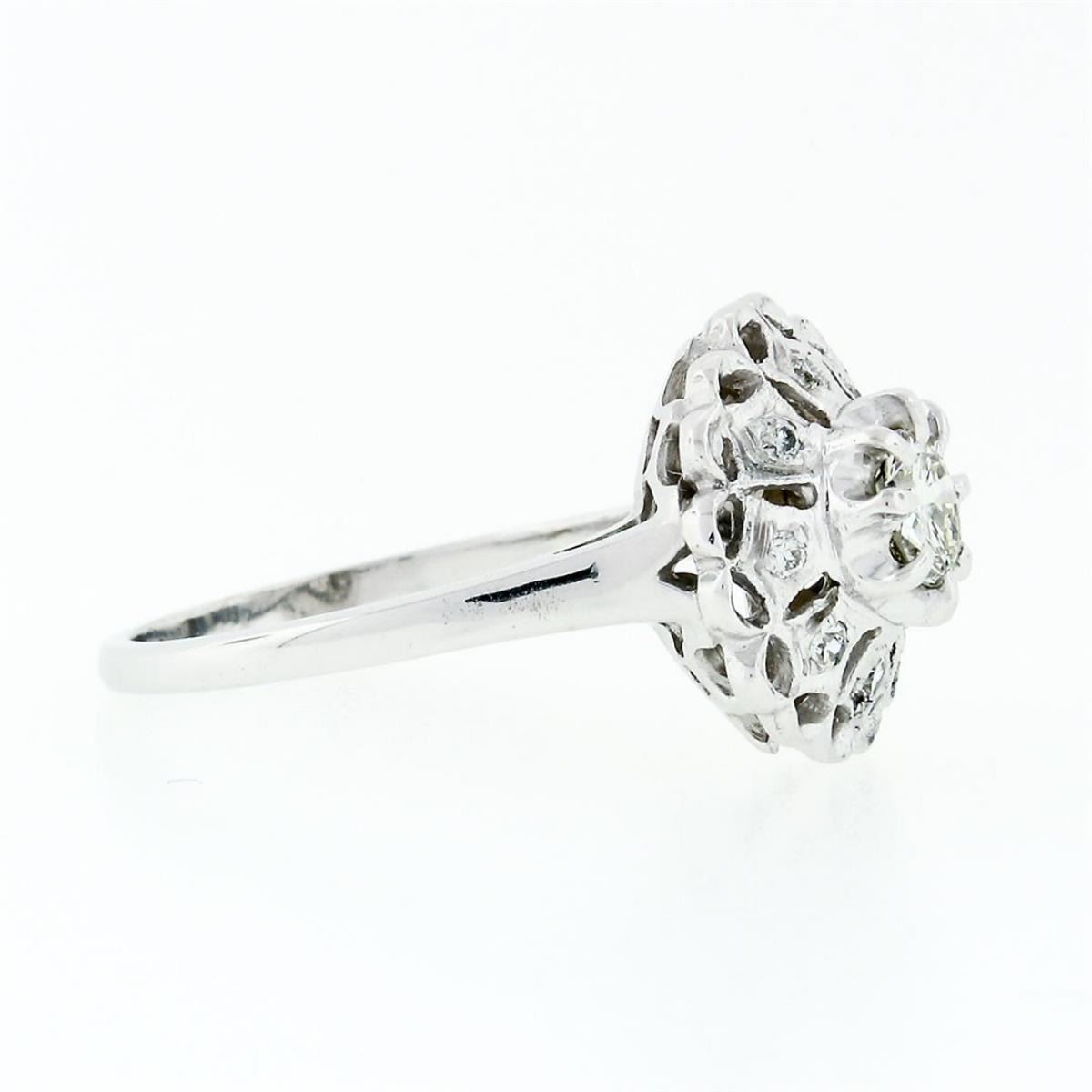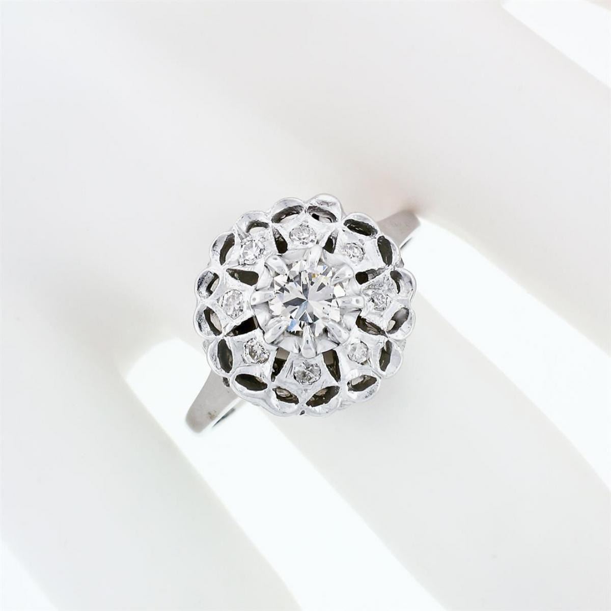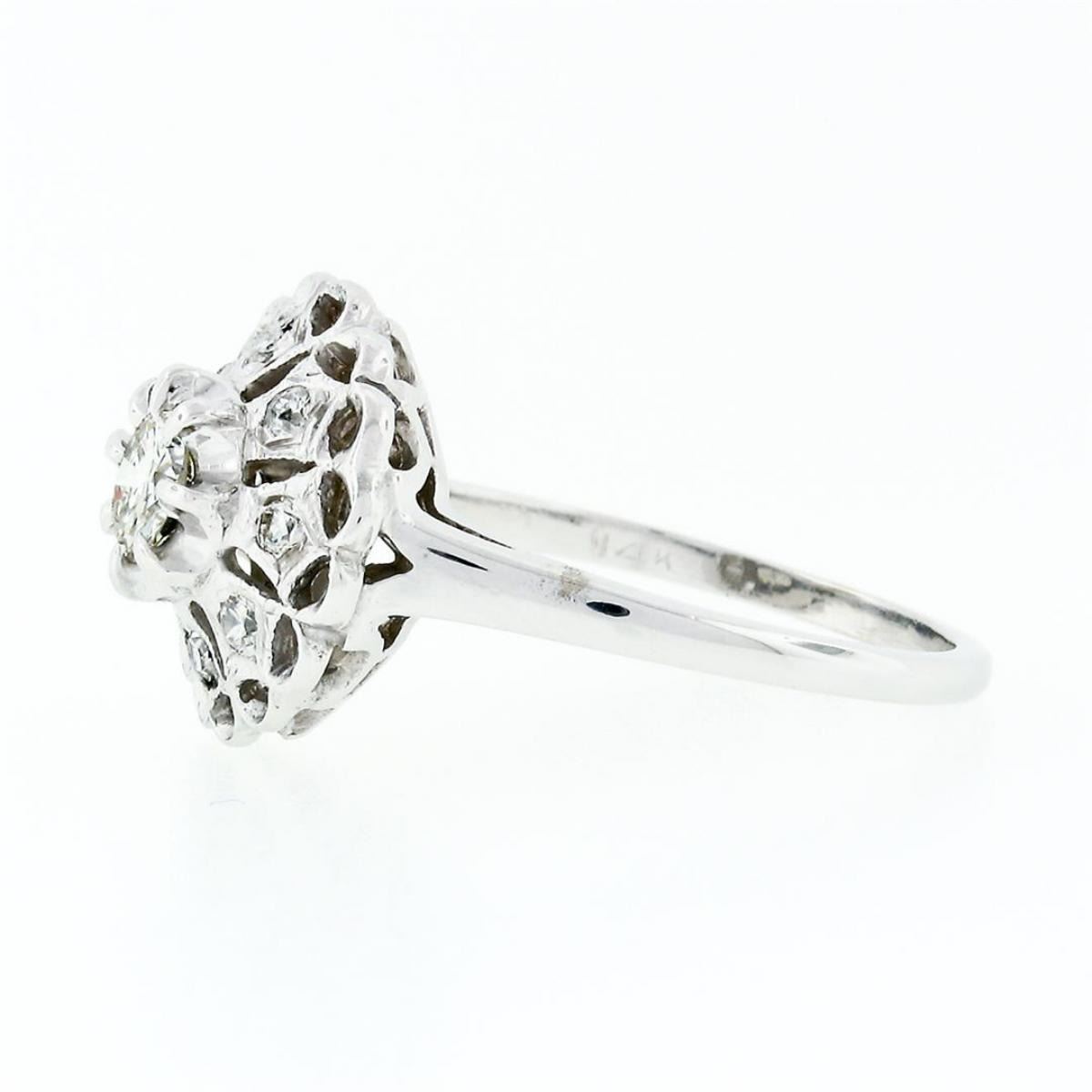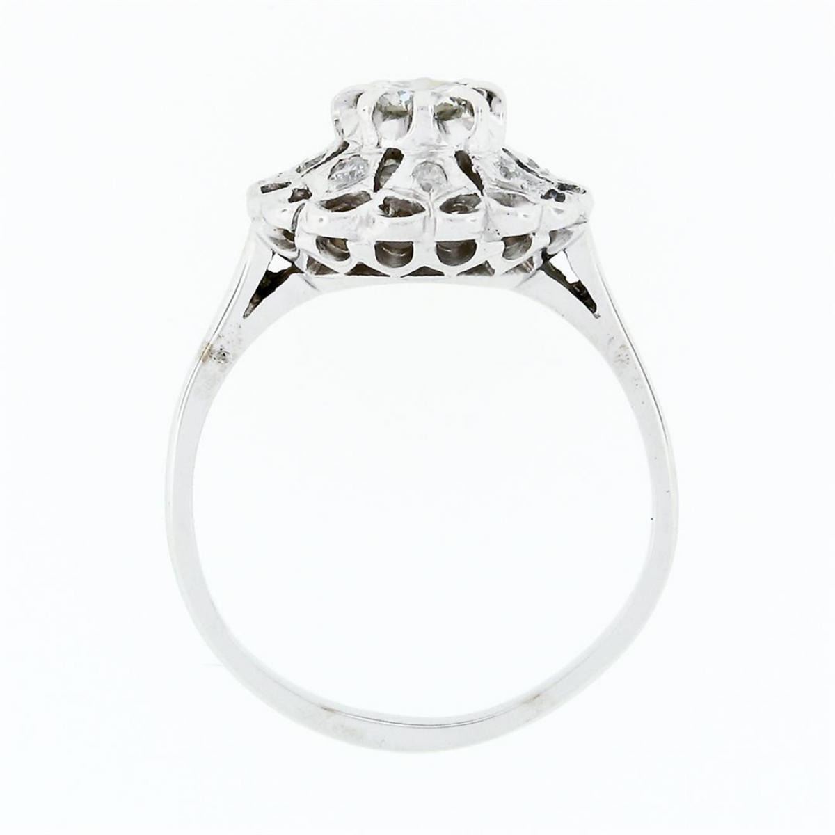 A vintage solid 14k white gold platter cluster ring with 1 round transitional cut natural diamond (J - VS1; 0.52ct) surrounded by 8 old round cut natural diamonds (H/I - VS1 to SI2; 0.18ctw). The ring is size 10.0, weighs a total of 4.93 grams, and measures 14.99mm wide.