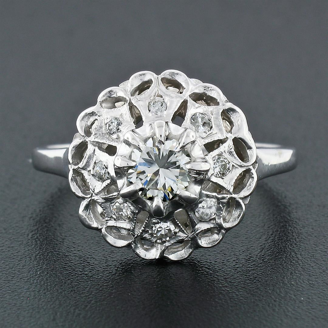 A vintage solid 14k white gold platter cluster ring with 1 round transitional cut natural diamond (J - VS1; 0.52ct) surrounded by 8 old round cut natural diamonds (H/I - VS1 to SI2; 0.18ctw). The ring is size 10.0, weighs a total of 4.93 grams, and measures 14.99mm wide.