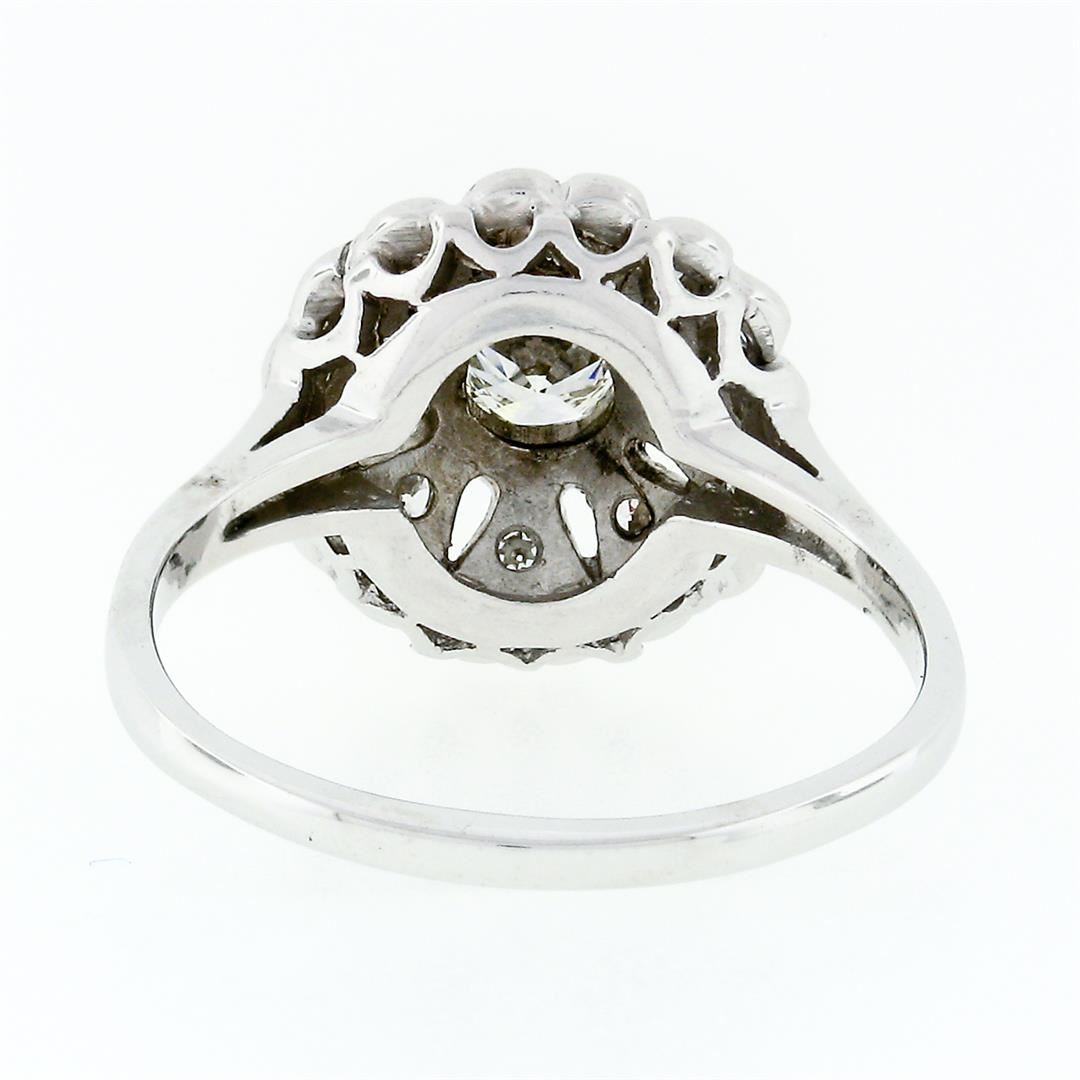 A vintage solid 14k white gold platter cluster ring with 1 round transitional cut natural diamond (J - VS1; 0.52ct) surrounded by 8 old round cut natural diamonds (H/I - VS1 to SI2; 0.18ctw). The ring is size 10.0, weighs a total of 4.93 grams, and measures 14.99mm wide.