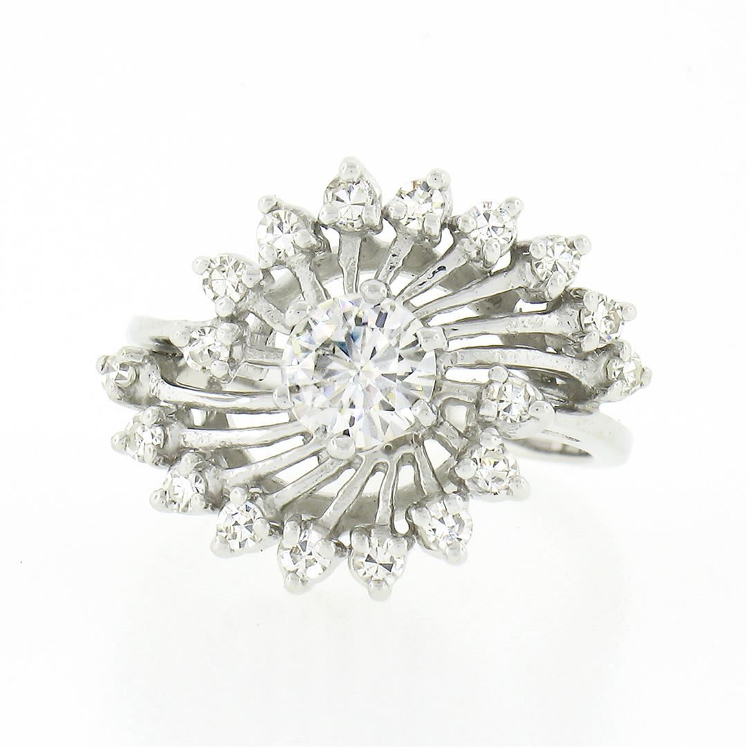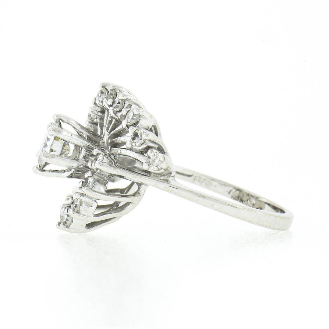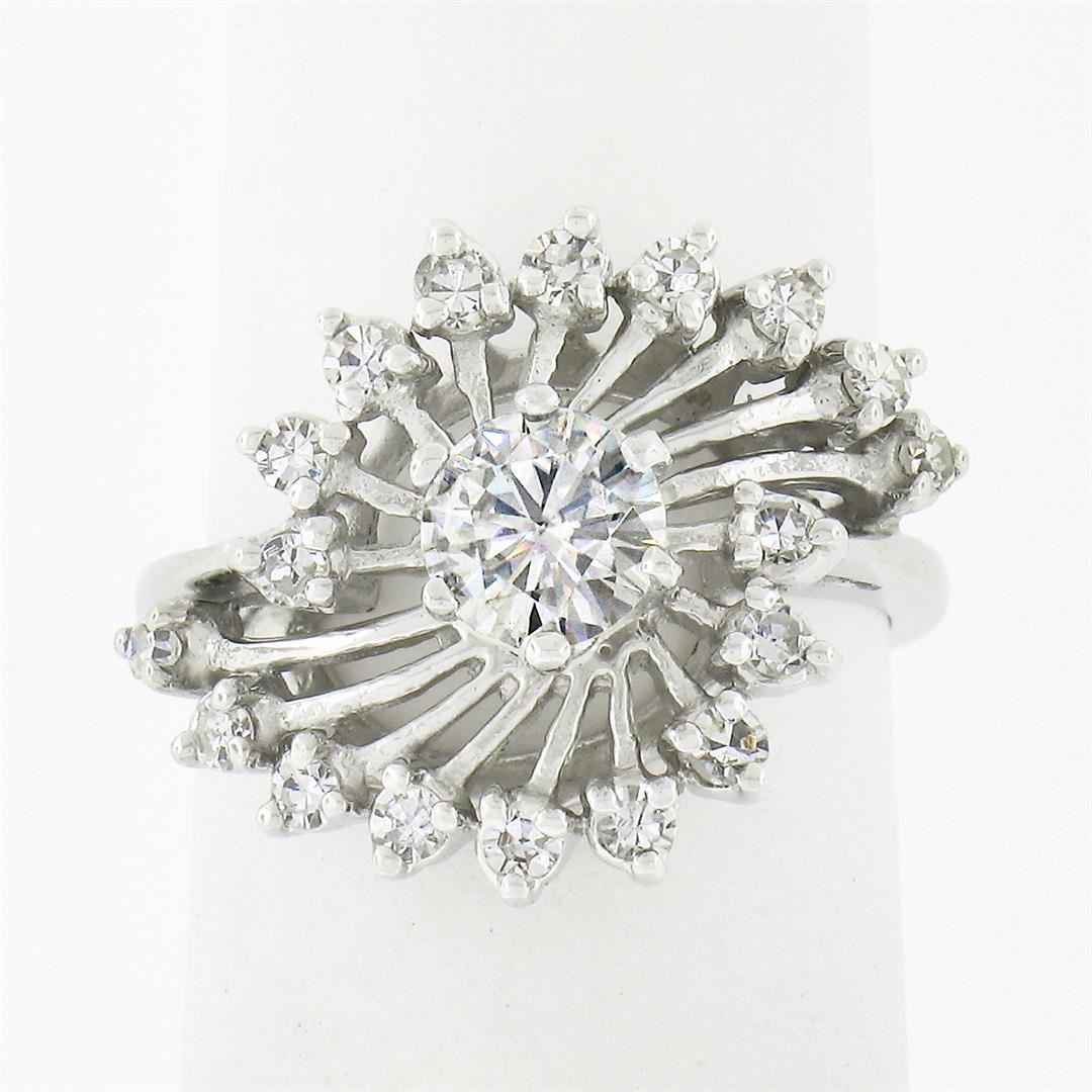 A solid 14k white gold cocktail ring, with 1 round brilliant cut natural diamond (I - VS1 ; 0.50ct), surrounded with 18 old single cut natural diamonds (G/H - VS1/VS2 ; 0.30ctw). The ring is size 4.0, weighs a total of 3.96 grams, and measures 14.65mm w