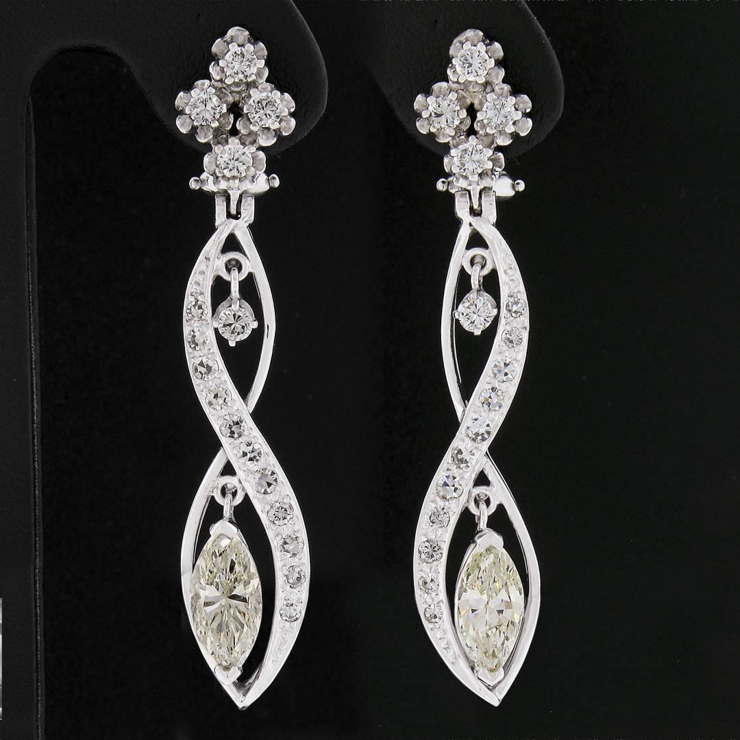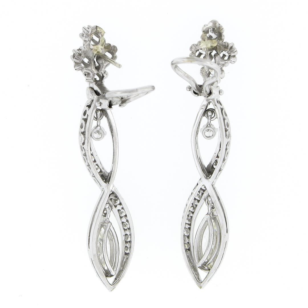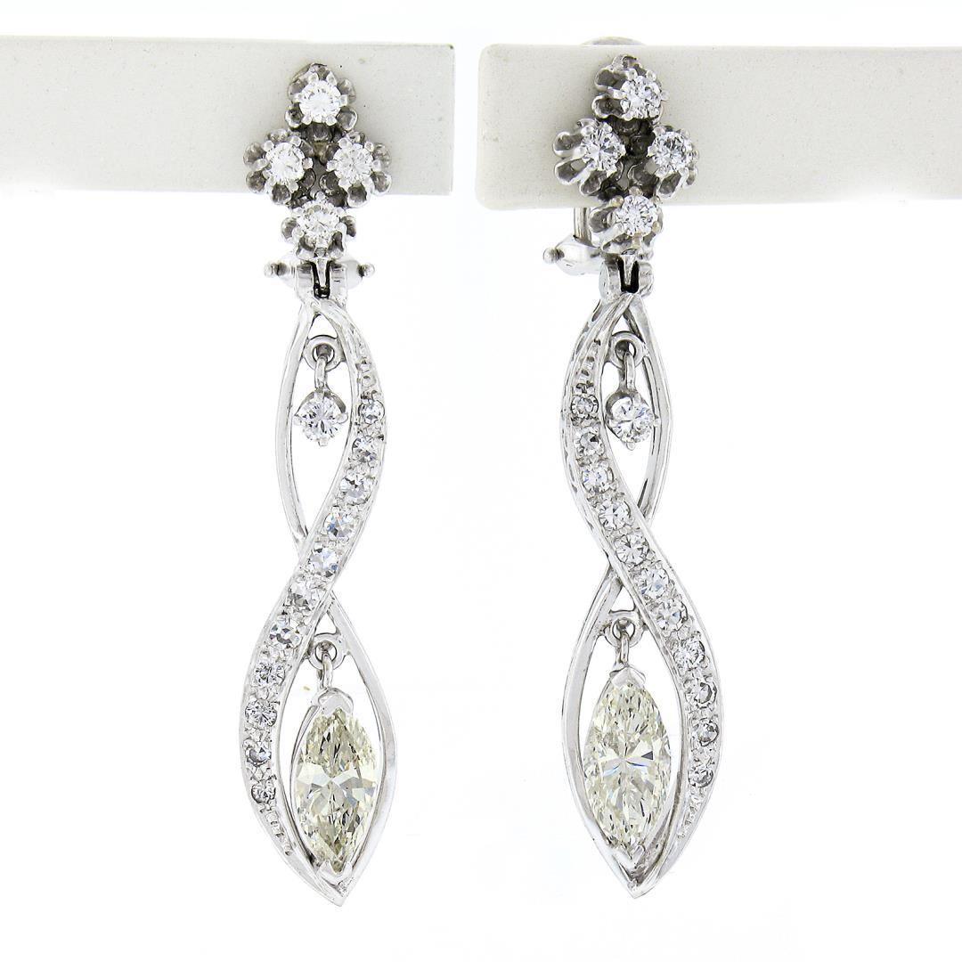 A vintage 14k white gold dangle earrings, featuring 2 marquise cut natural diamonds (K/L - SI1/SI2 ; 2.60ctw), and 32 old single & round brilliant cut natural diamonds (G/H - VS1/VS2 ; 1.40ctw). The earrings measure approximately 51.50x9.60mm and weigh a total of 9.91 grams.