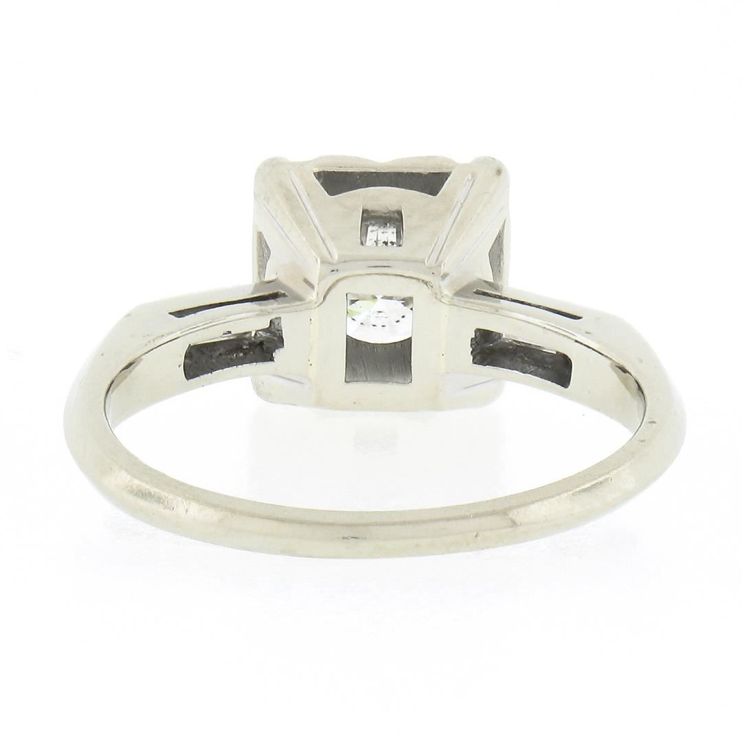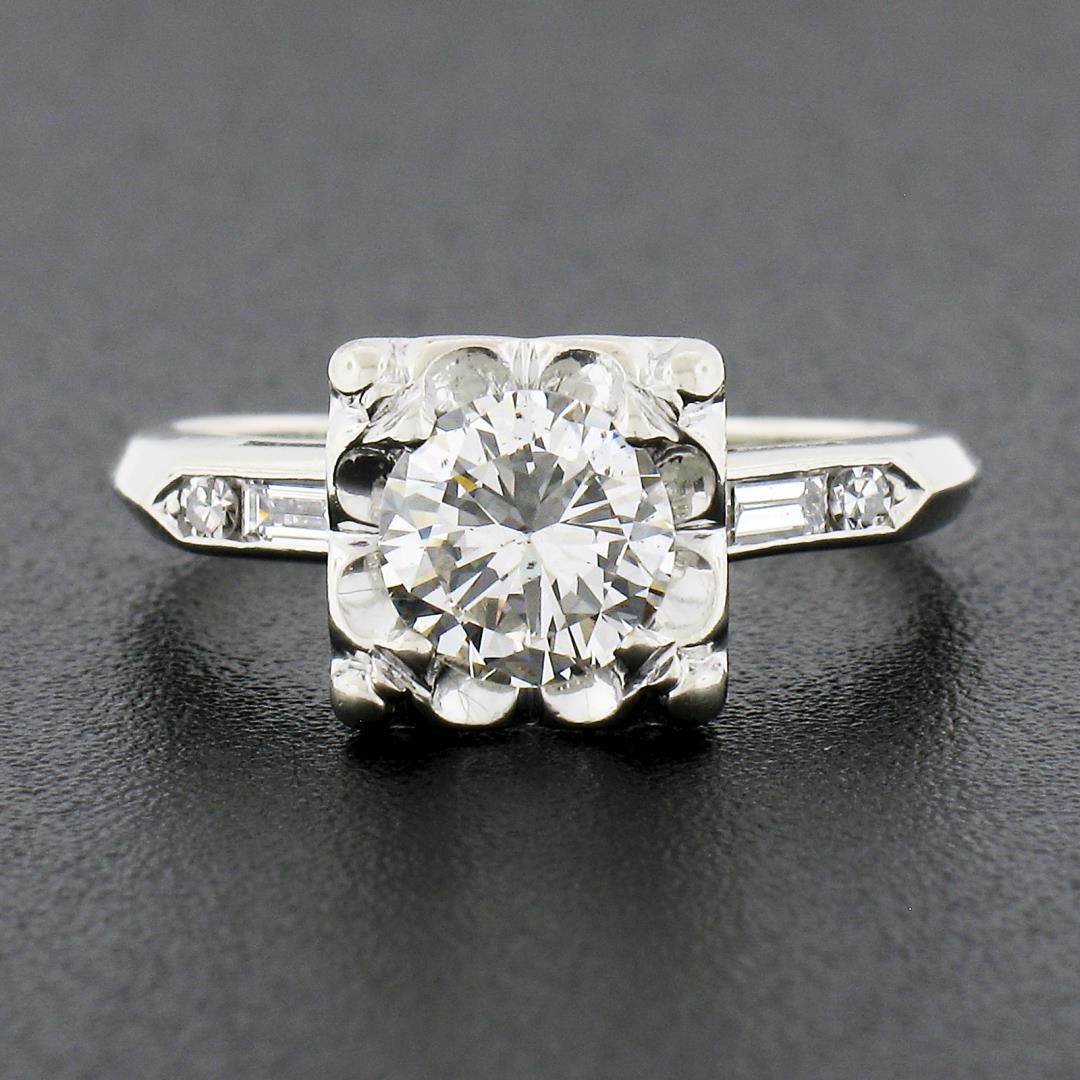 A vintage solid 14k white gold engagement ring, with 1 old transitional cut, 2 baguette cut & 2 single cut natural diamonds (G/H - VS1-SI1 ; 0.94ctw). The ring is size 4.5, weighs a total of 2.70 grams, and measures 8mm wide.