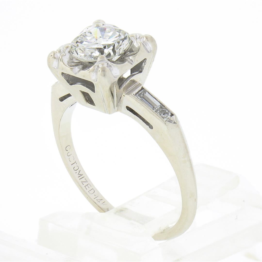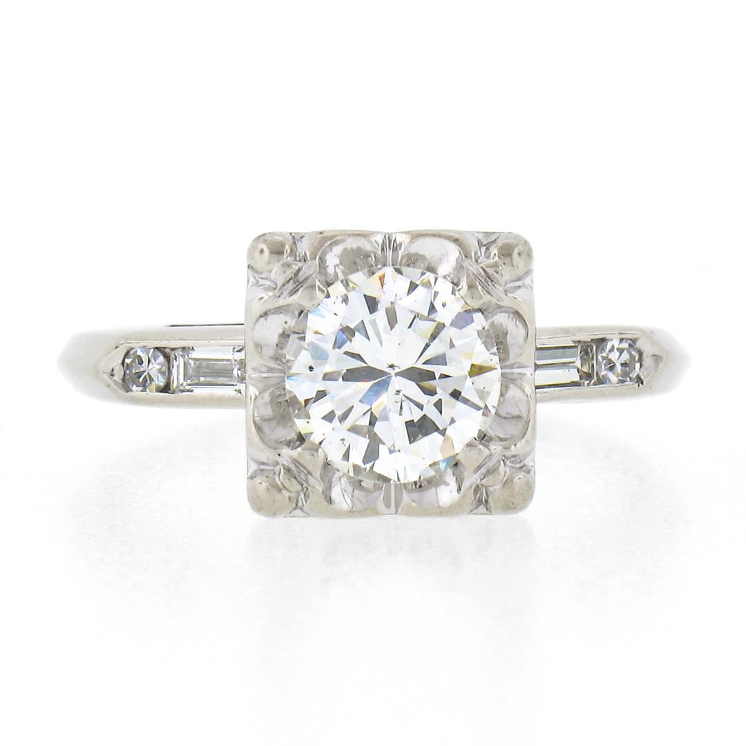 A vintage solid 14k white gold engagement ring, with 1 old transitional cut, 2 baguette cut & 2 single cut natural diamonds (G/H - VS1-SI1 ; 0.94ctw). The ring is size 4.5, weighs a total of 2.70 grams, and measures 8mm wide.