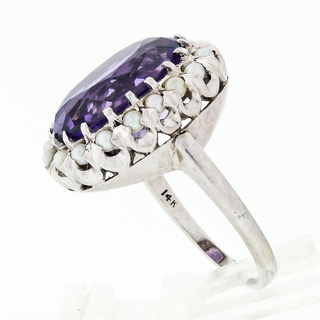 A vintage solid 14k white gold ring with 1 large oval cut natural amethyst (17.02x13.18mm) surrounded with a halo of 18 round bead shape cultured pearls (2.25mm). The ring is size 9.5, weighs a total of 10.84 grams, and measures 22.41mm wide.