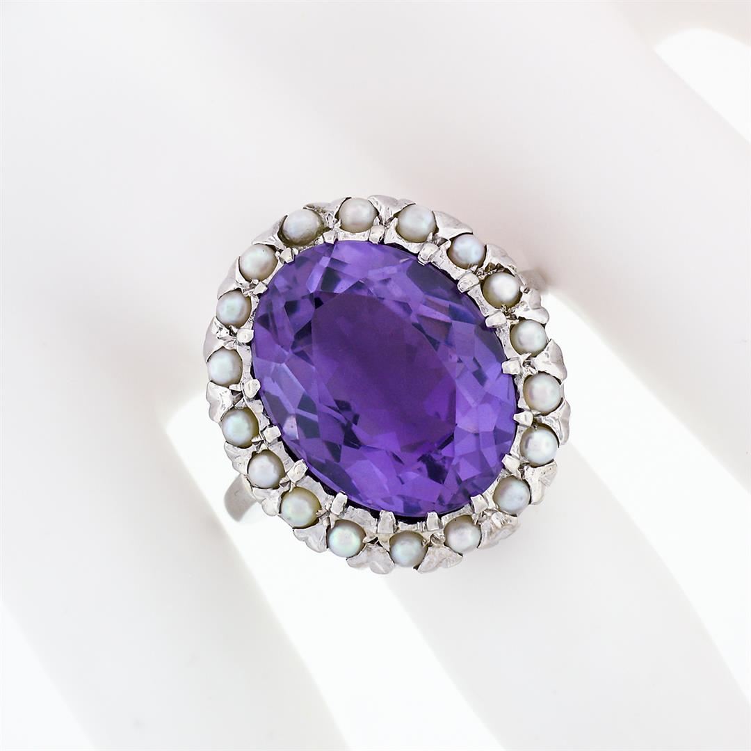 A vintage solid 14k white gold ring with 1 large oval cut natural amethyst (17.02x13.18mm) surrounded with a halo of 18 round bead shape cultured pearls (2.25mm). The ring is size 9.5, weighs a total of 10.84 grams, and measures 22.41mm wide.