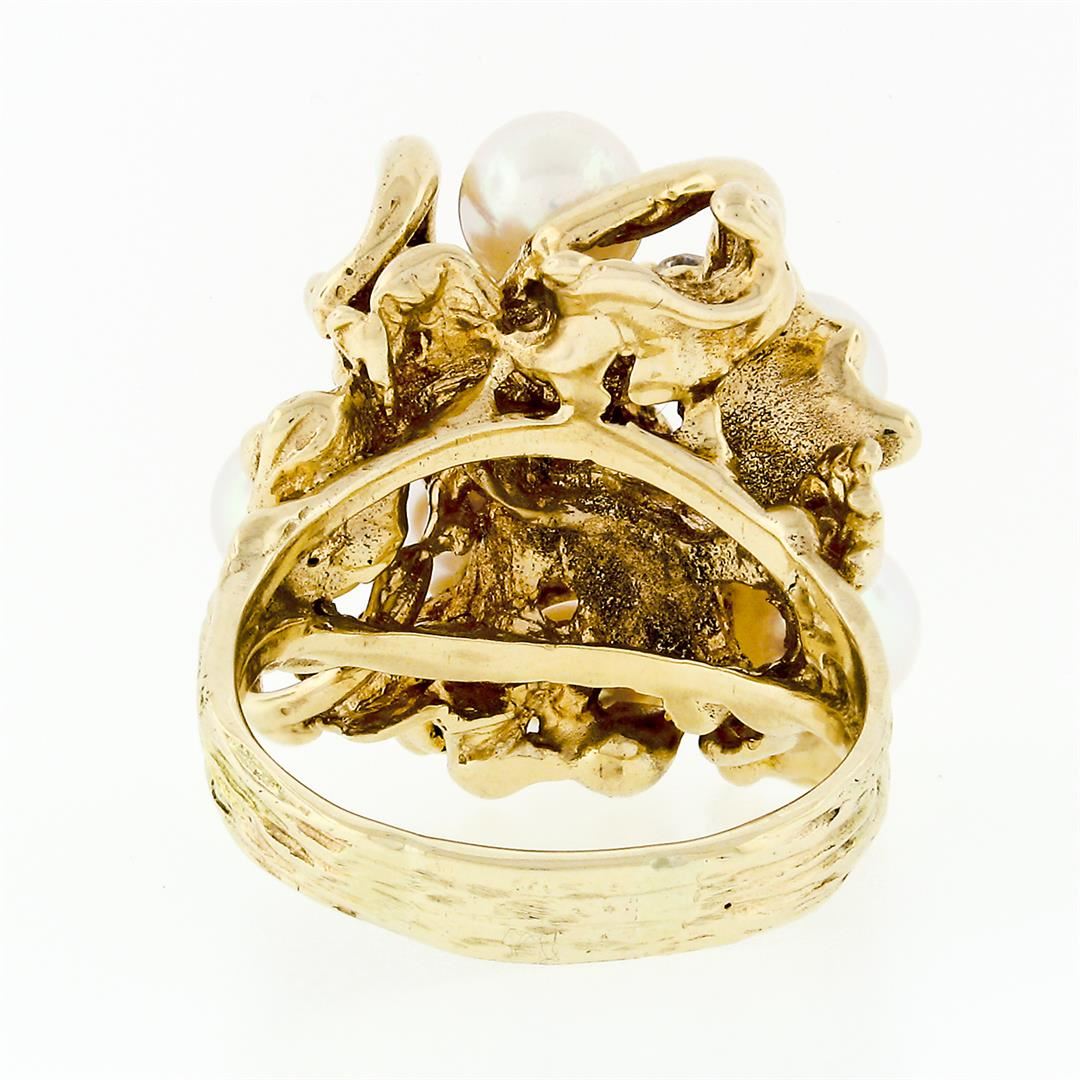 A vintage solid 14k yellow gold statement ring, with 3 round brilliant cut natural diamonds (F/G- VS1/VS2; 0.15ctw), & 6 round shape cultured pearls (6.0mm). The ring is size 8.0, weighs a total of 16.33 grams, and measures 22.87mm wide.