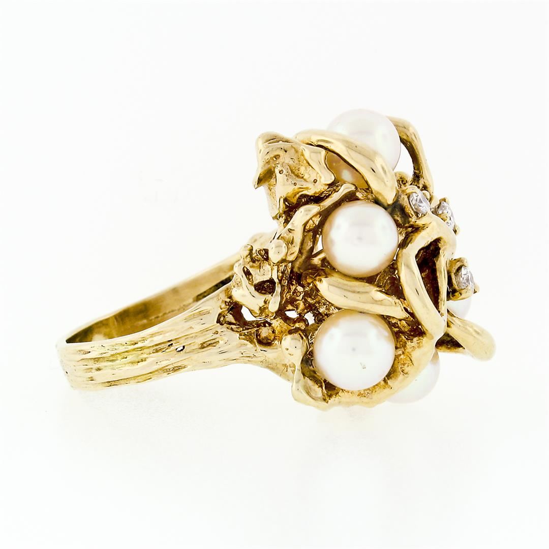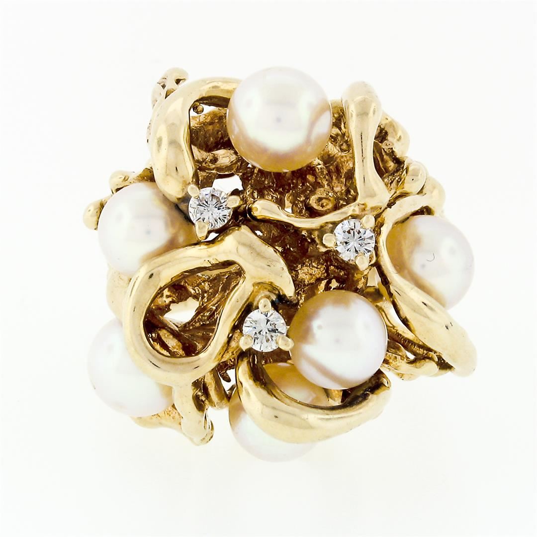 A vintage solid 14k yellow gold statement ring, with 3 round brilliant cut natural diamonds (F/G- VS1/VS2; 0.15ctw), & 6 round shape cultured pearls (6.0mm). The ring is size 8.0, weighs a total of 16.33 grams, and measures 22.87mm wide.