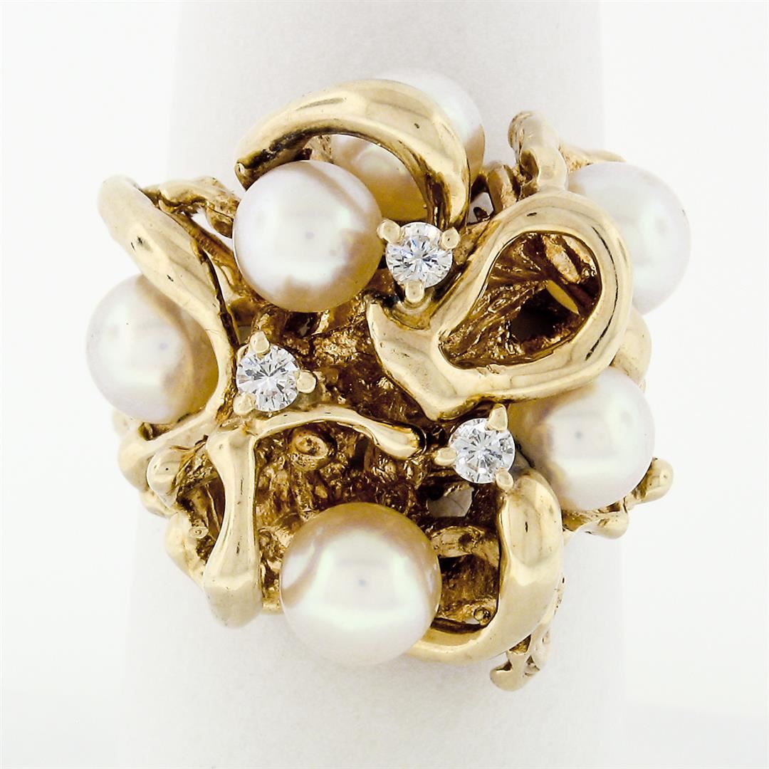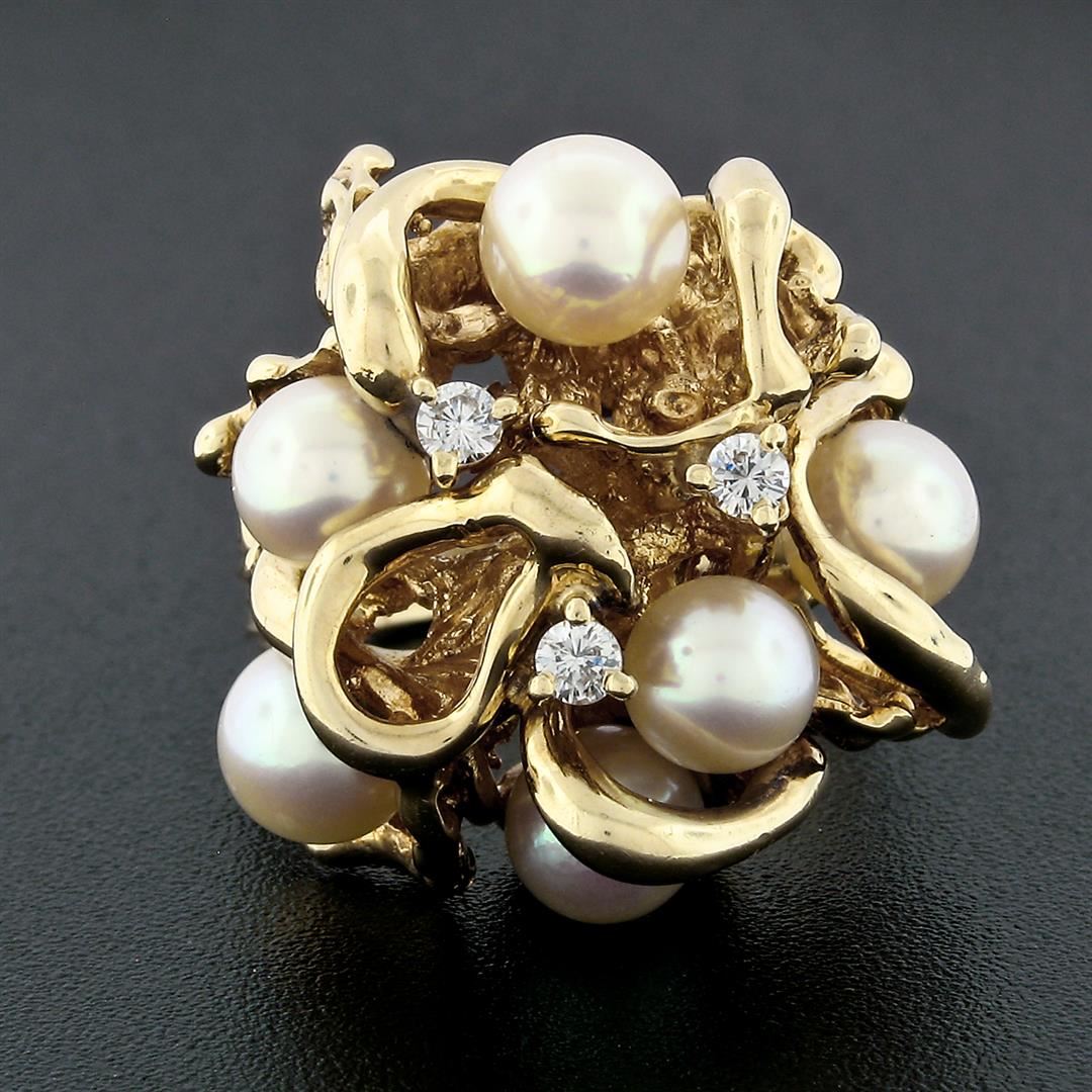A vintage solid 14k yellow gold statement ring, with 3 round brilliant cut natural diamonds (F/G- VS1/VS2; 0.15ctw), & 6 round shape cultured pearls (6.0mm). The ring is size 8.0, weighs a total of 16.33 grams, and measures 22.87mm wide.