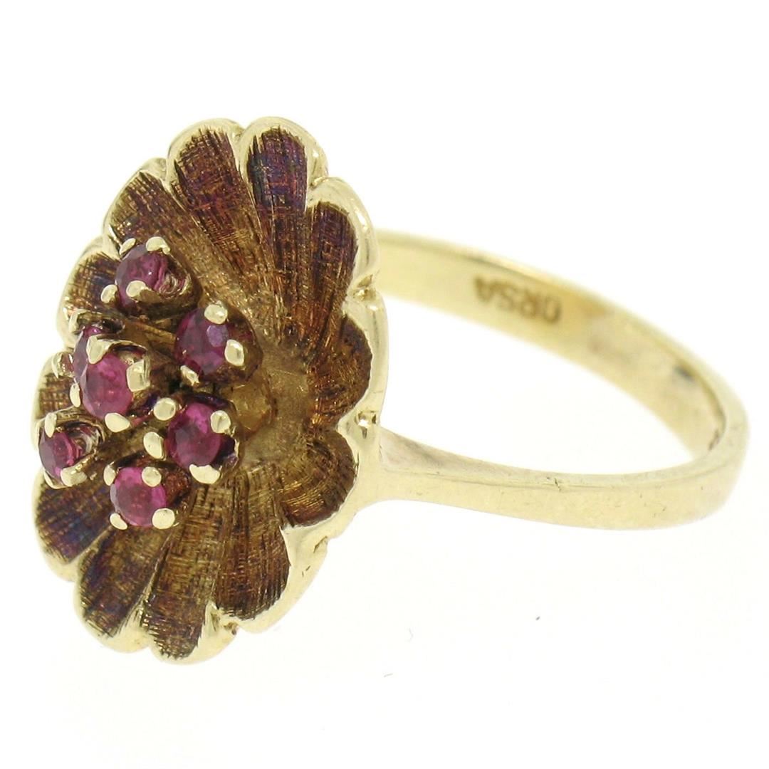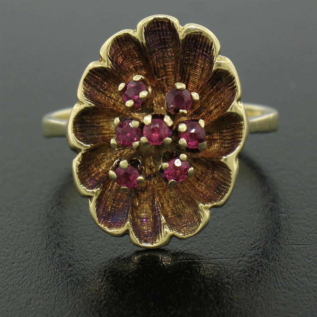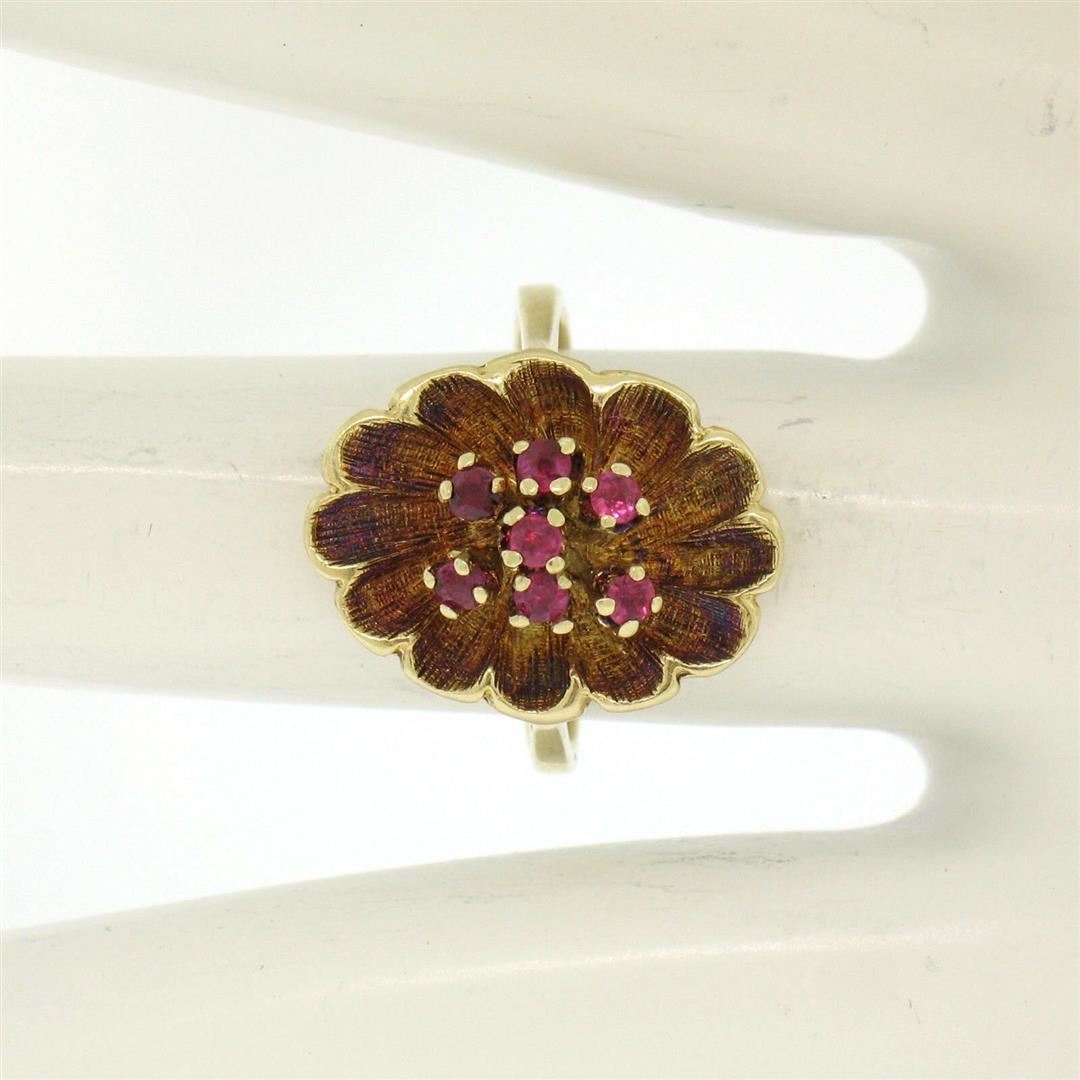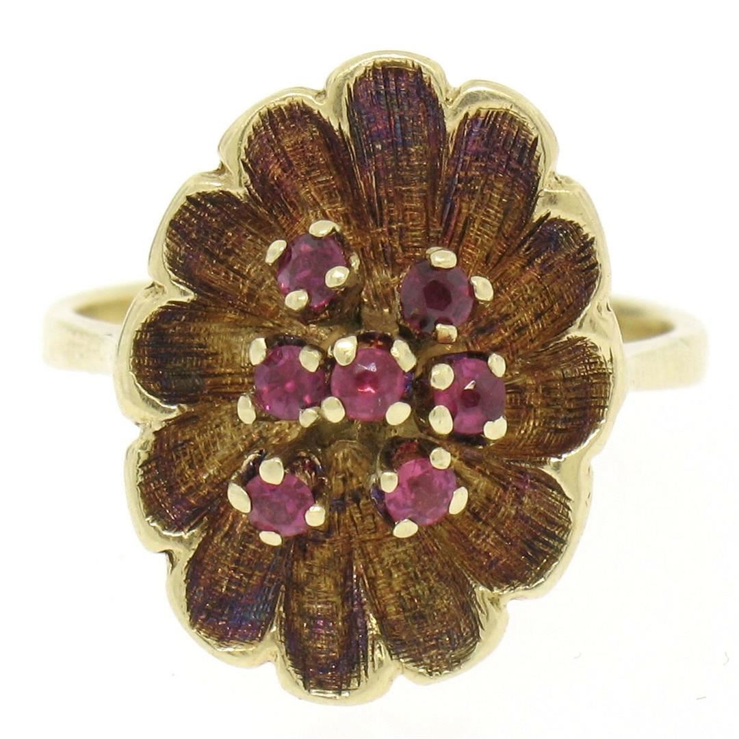 One Vintage 14k Yellow Gold 0.25ctw Round Ruby Cluster Brushed Texture Flower Ring. Item Details: Material: Solid 14k Yellow Gold, Weight: 3.46 Grams, Stone(s): (7) Natural Genuine Rubies - Round Cut - Prong Set - Rich Blood Red Color, Total Carat Weight: 0.25 (approx.), Ring Size: 5.5 , Ring Width: 17.07mm, Ring Height: 7.03mm rise off the finger, Condition: Vintage piece w/ original patina. Excellent condition!
