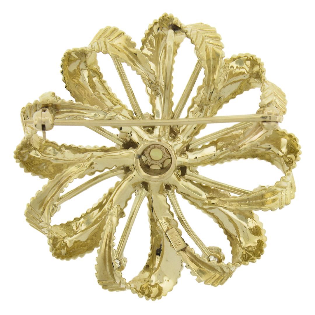 A vintage solid 14k yellow gold flower brooch, featurgin 8 round cut natural diamonds (G - VS2 ; 0.28ctw). and 19 round cabochon cut natural opals. Measures 43.3mm in diameter and weighs a total of 16.4 grams.