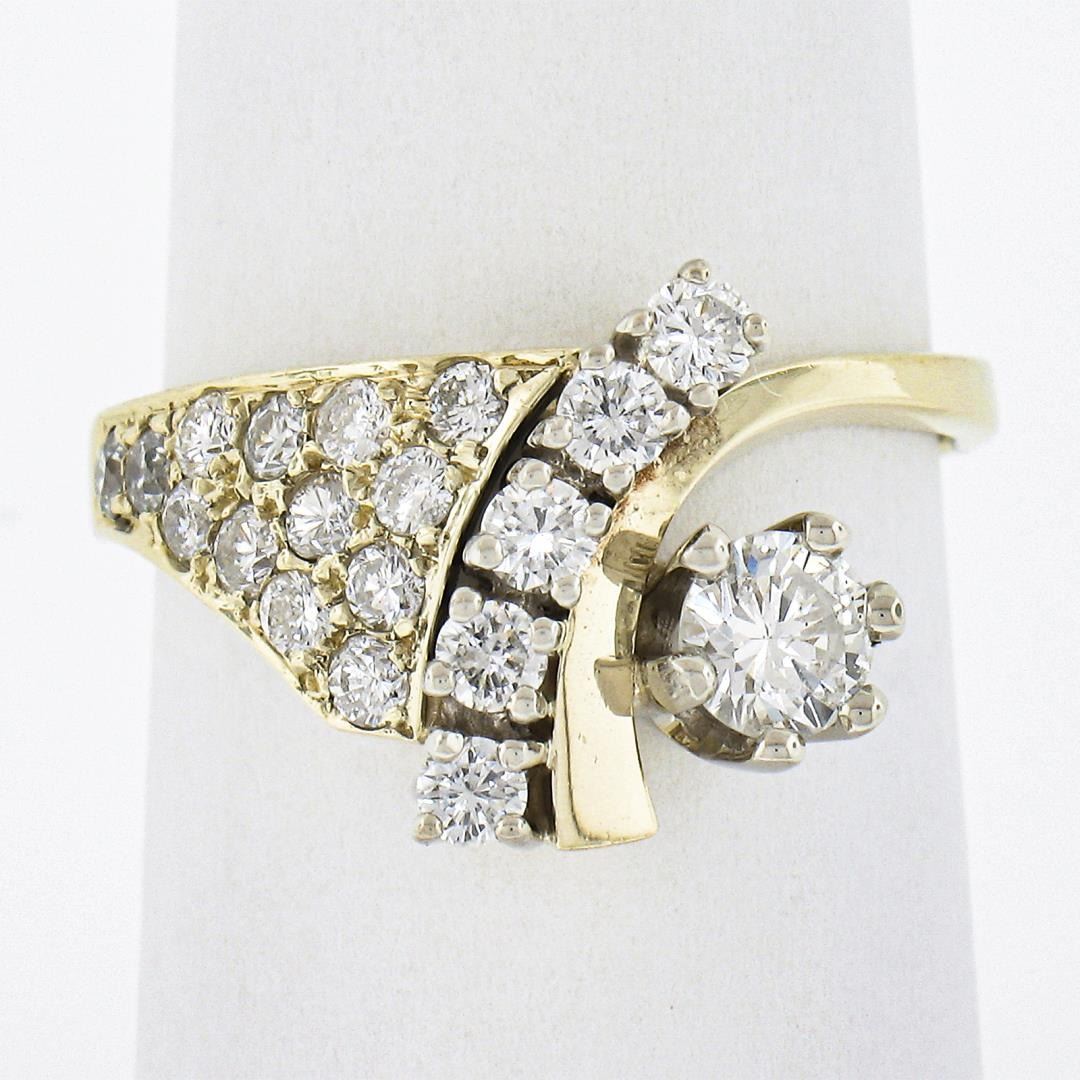 A vintage solid 14k yellow gold ring, with 19 round cut natural diamonds (G/H - SI1-I1 ; 0.90ctw). The ring is size 7.0, weighs a total of 4.82 grams, and measures 12.7mm wide.
