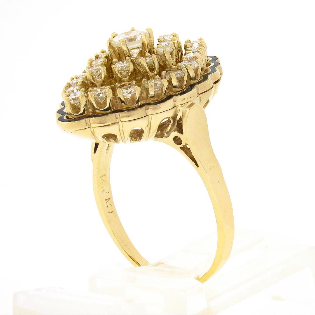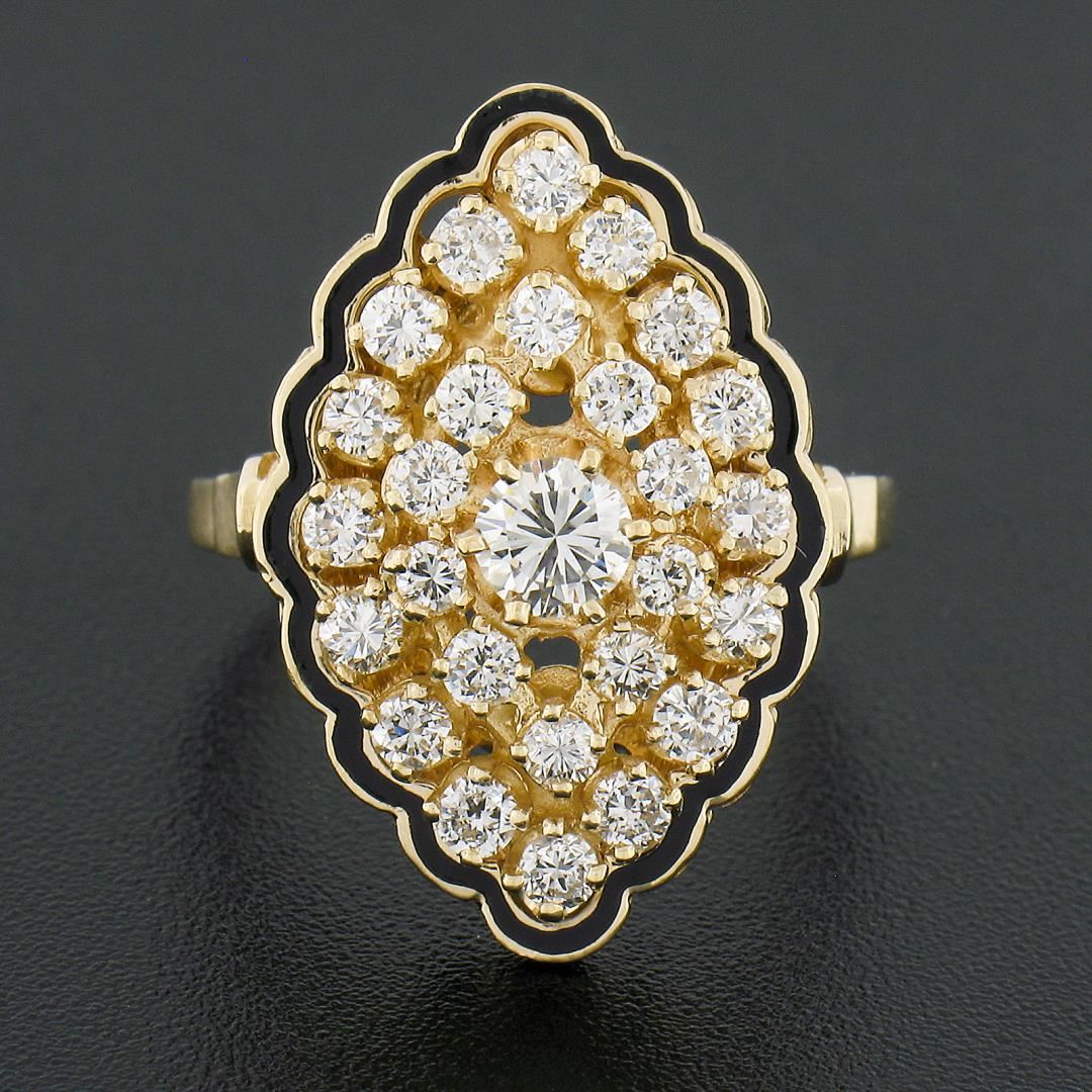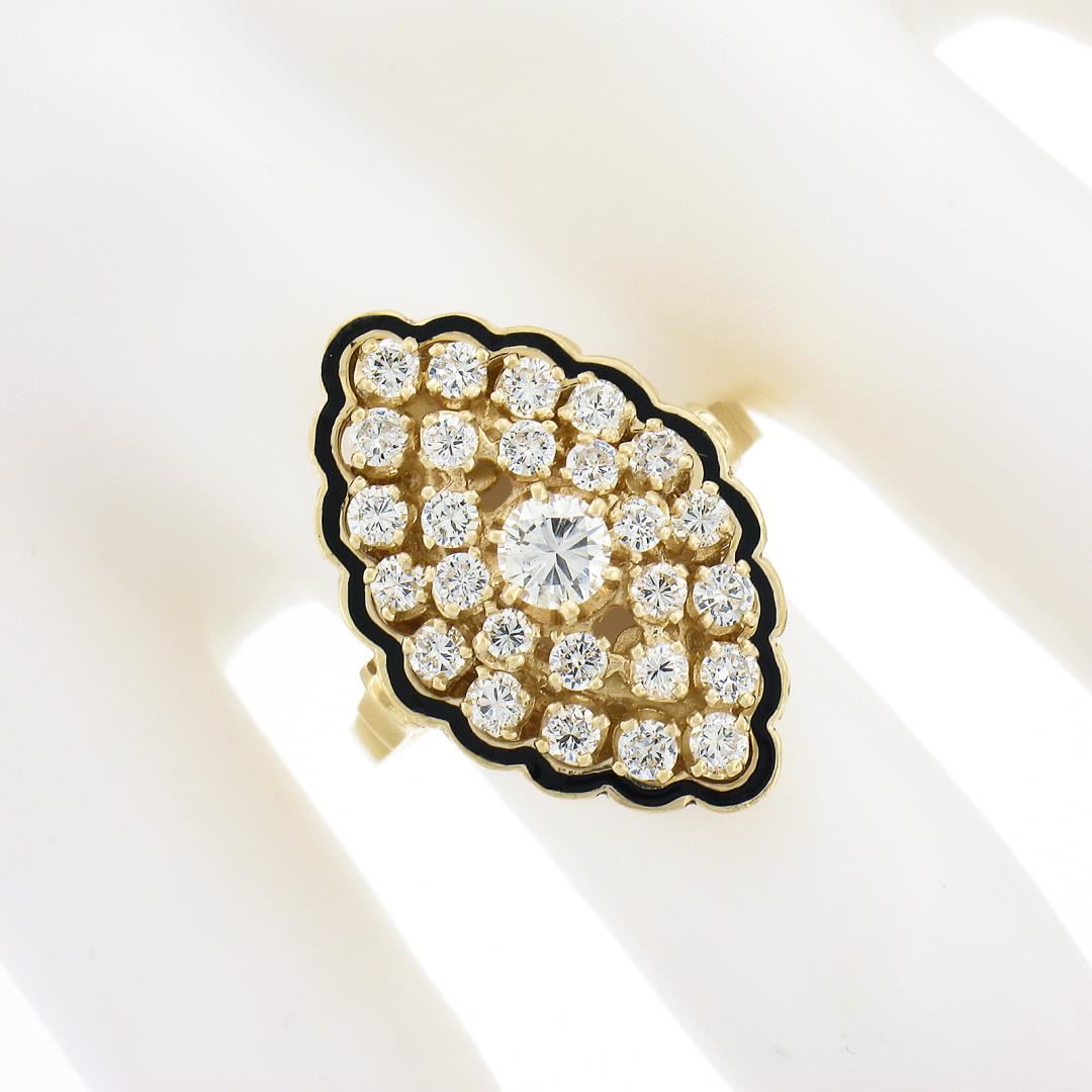 A vintage solid 14k yellow gold cocktail ring, with enamel work and 27 round brilliant cut natural diamonds (G/H - VS2/SI1 ; 1.12ctw). The ring is size 8.0, weighs a total of 7.04 grams, and measures 23.70mm wide.