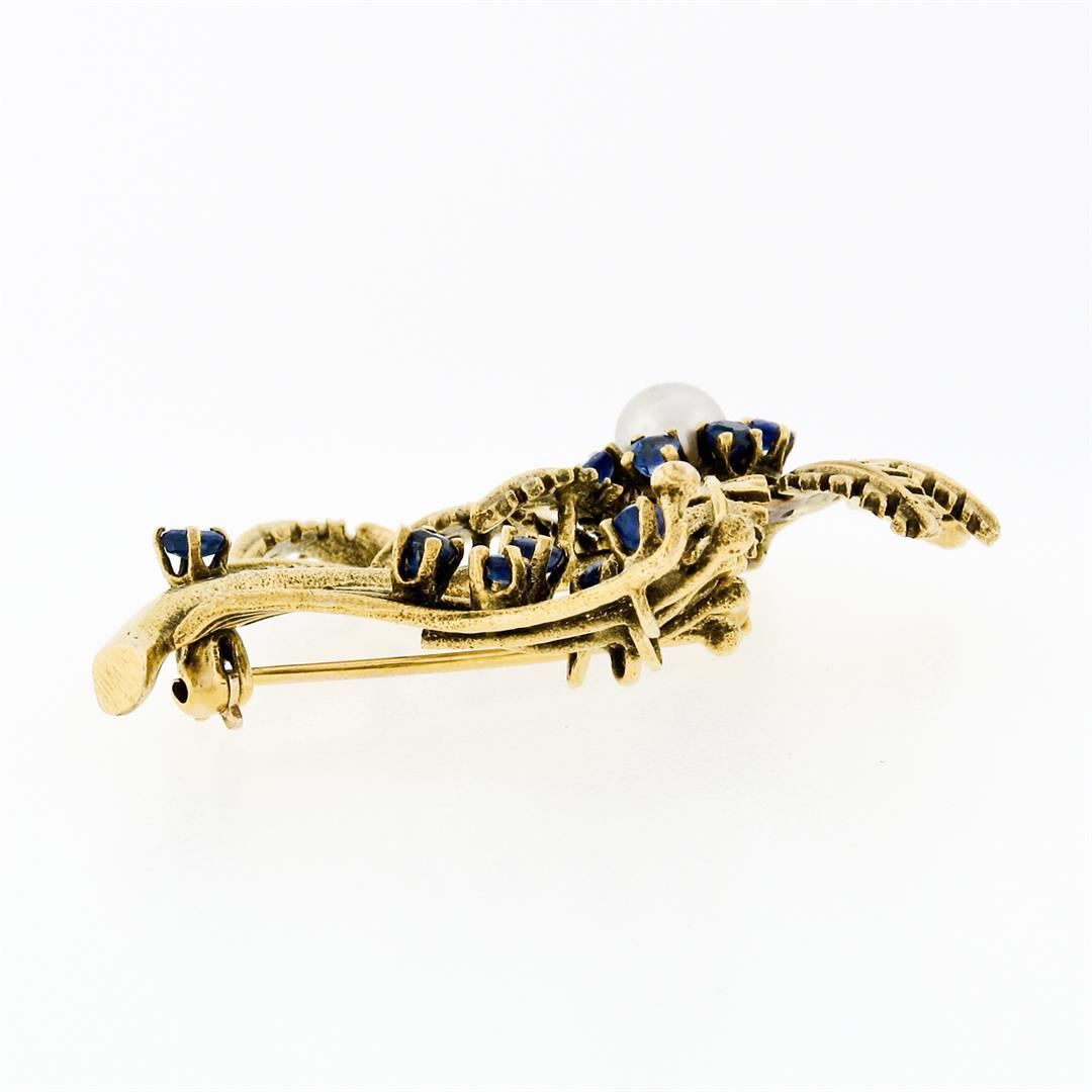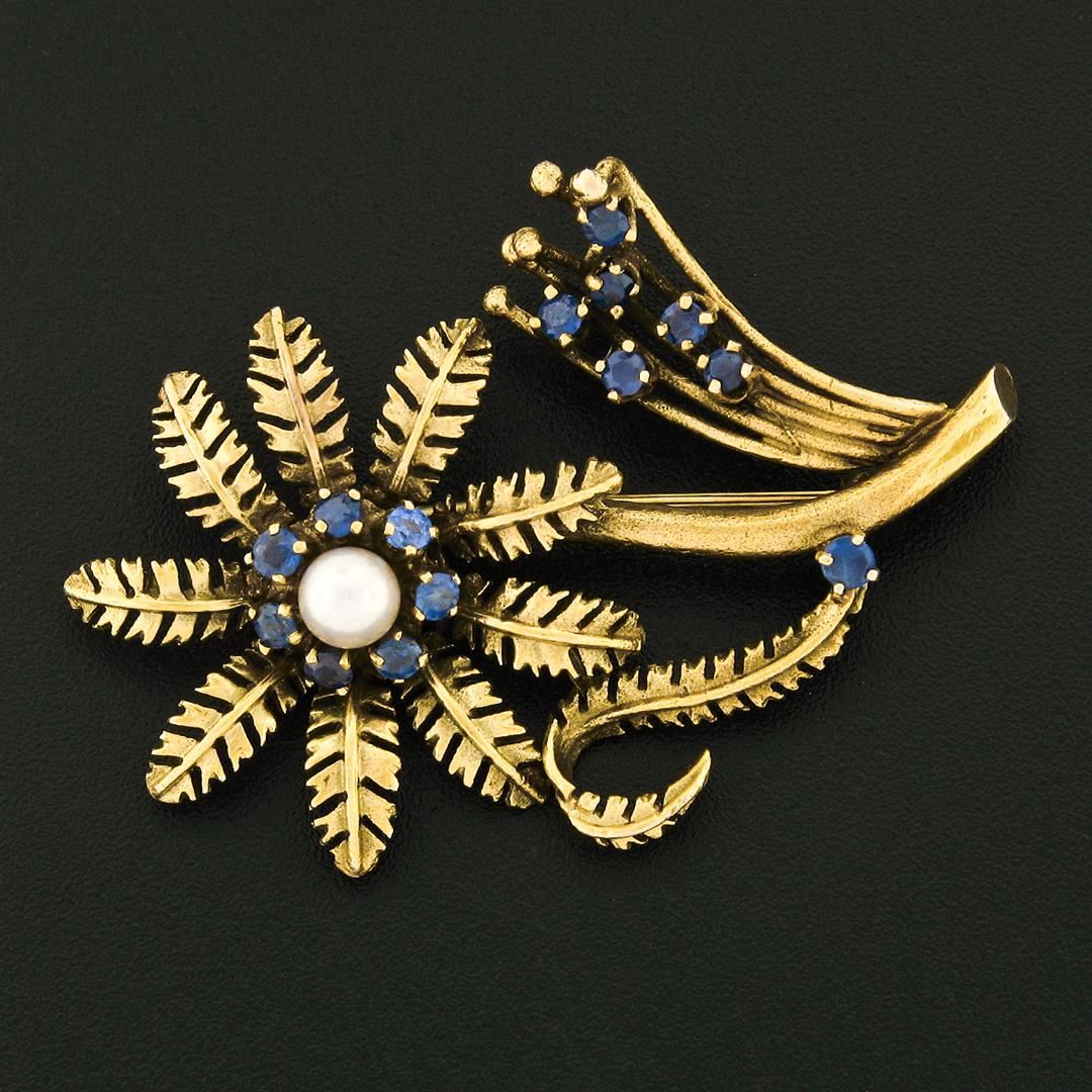 A vintage solid 14k yellow gold flower pin brooch, with 14 round cut natural sapphires (1.20ctw), and 1 round shape natural cultured pearl (5.20mm). Measures 49.60x36.60mm and weighs a total of 10.09 grams.
