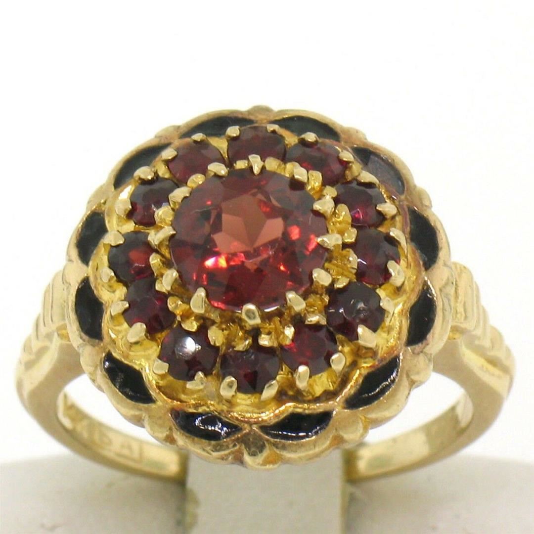 Vintage 14k Yellow Gold 1.5 ctw Round Garnet & Black Enamel Champleve Flower Rin