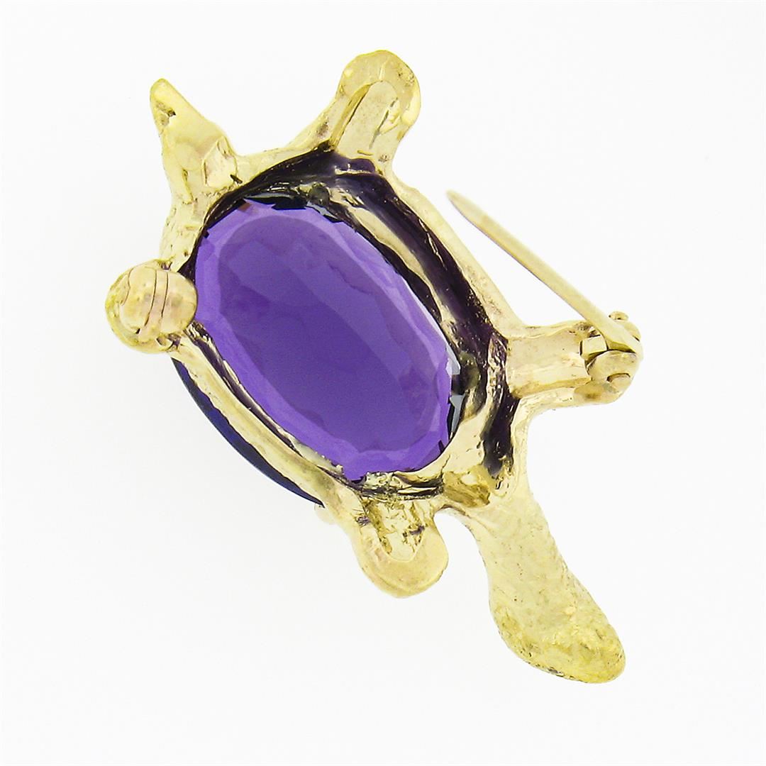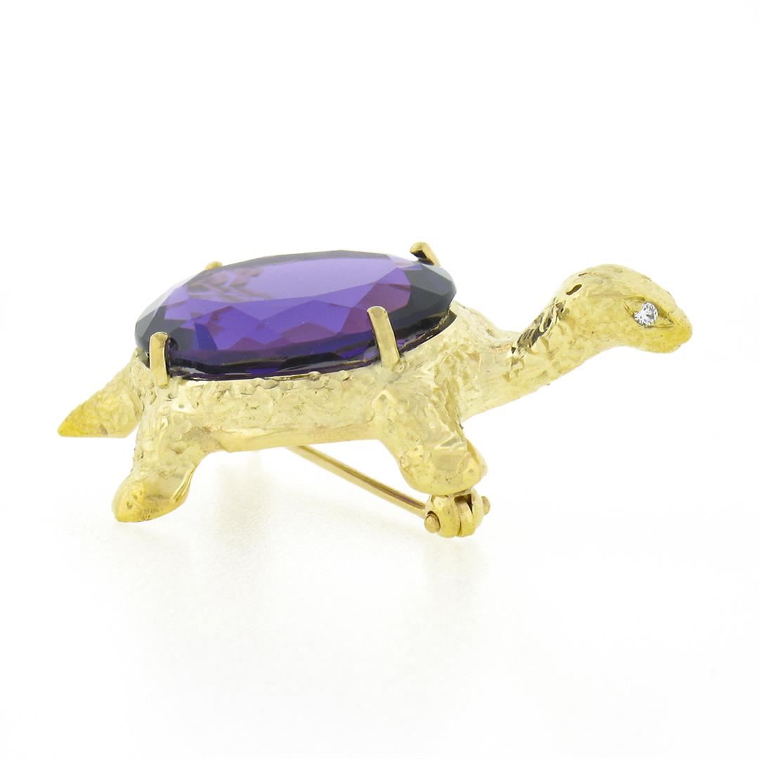 A solid 14k yellow gold turtle pin brooch, with 1 oval brilliant cut natural amethyst (17.56x12.75mm - 11.0ct), and 2 round brilliant cut natural diamonds (F - VS2 ; 0.01ctw). Measures 20.25x35.55mm and weighs a total of 9.0 grams.