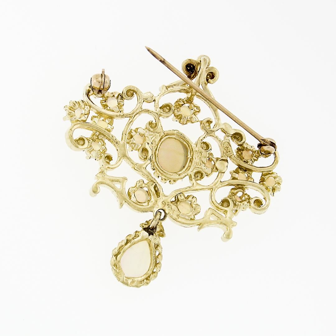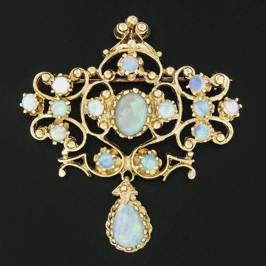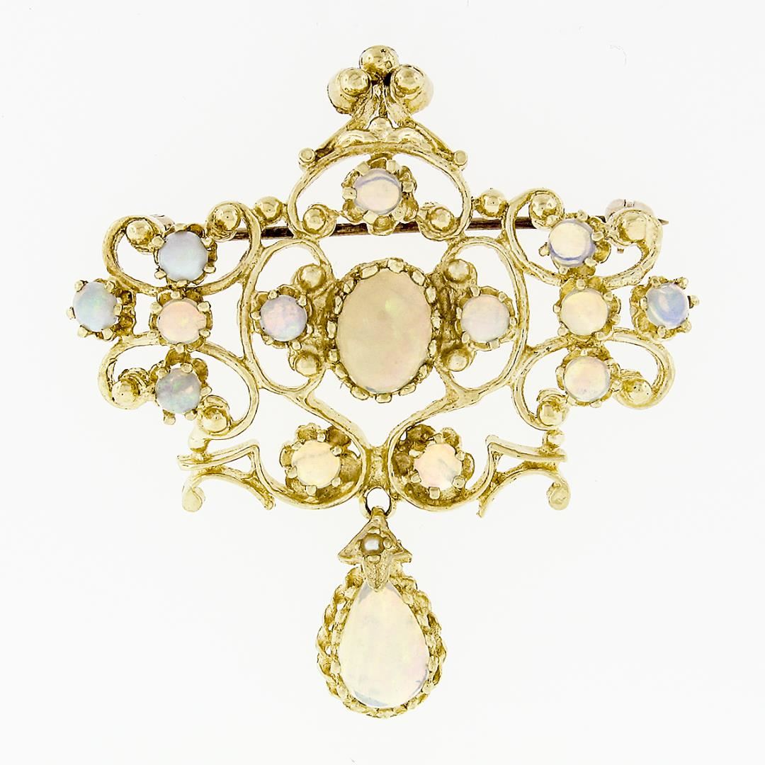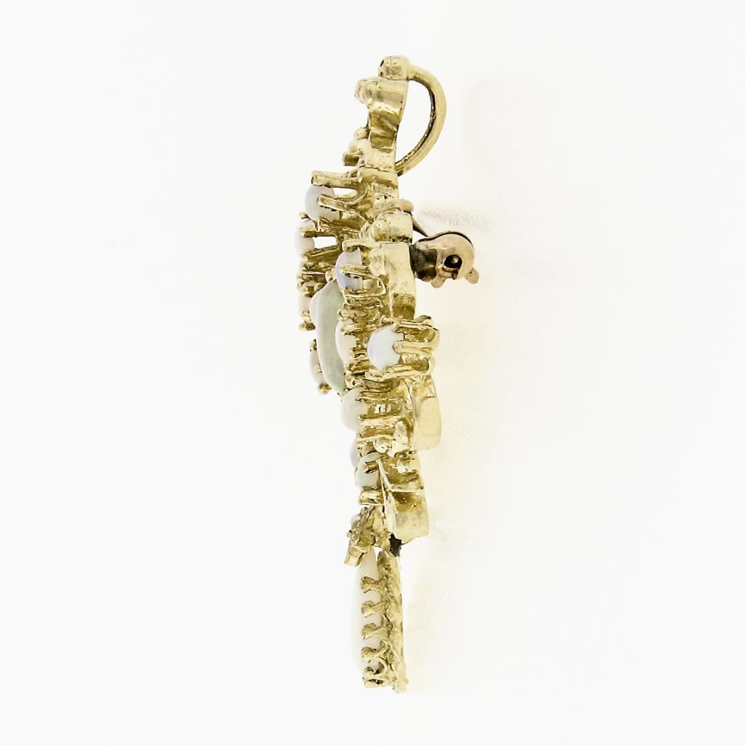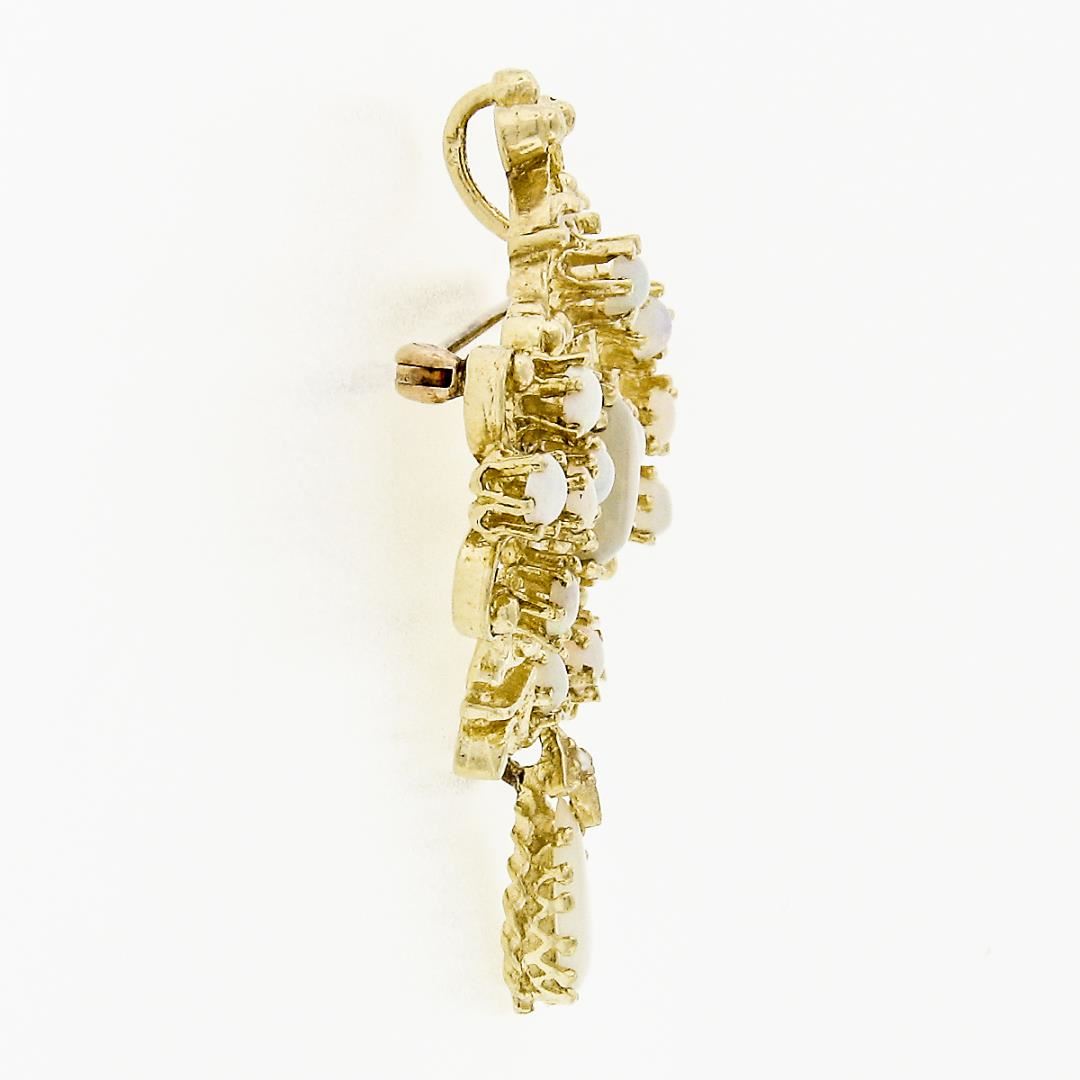 A vintage solid 14k yellow gold dangle brooch pendant, with 1 oval cabochon cut natural opal (8.5x2.4mm - 0.63c), 1 pear cabochon cut natrual opal (8.8x5.9mm - 0.48ct), and 13 round cabochon cut natural opals (3.1mm - 0.91ctw ). Measures 43.6x40.5mm and weighs a total of 9.56 grams, and inside bail measurements 4.5x2mm.