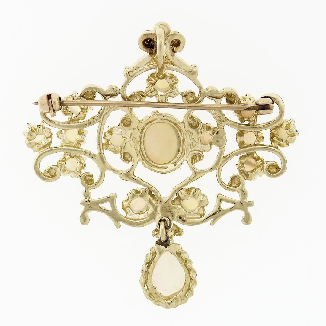 A vintage solid 14k yellow gold dangle brooch pendant, with 1 oval cabochon cut natural opal (8.5x2.4mm - 0.63c), 1 pear cabochon cut natrual opal (8.8x5.9mm - 0.48ct), and 13 round cabochon cut natural opals (3.1mm - 0.91ctw ). Measures 43.6x40.5mm and weighs a total of 9.56 grams, and inside bail measurements 4.5x2mm.