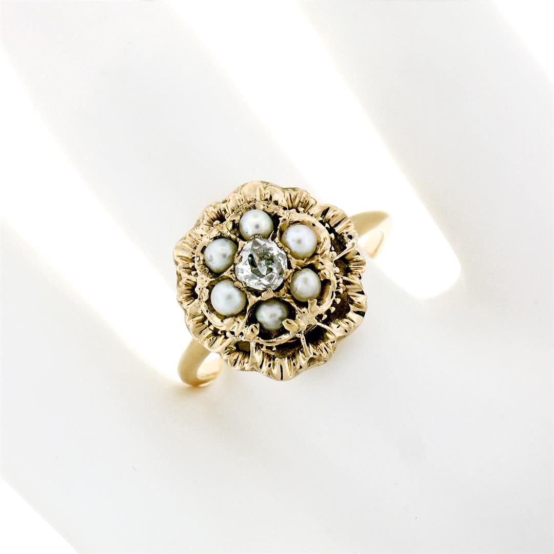 A vintage solid 14k yellow gold tiered ring, with 1 old european cut natural diamond (F - I1 ; 0.21ct), surrounded with 6 round shape natural seed pearls ( 2.6mm). The ring is size 8.0, weighs a total of 4.29 grams, and measures 15.0mm wide.