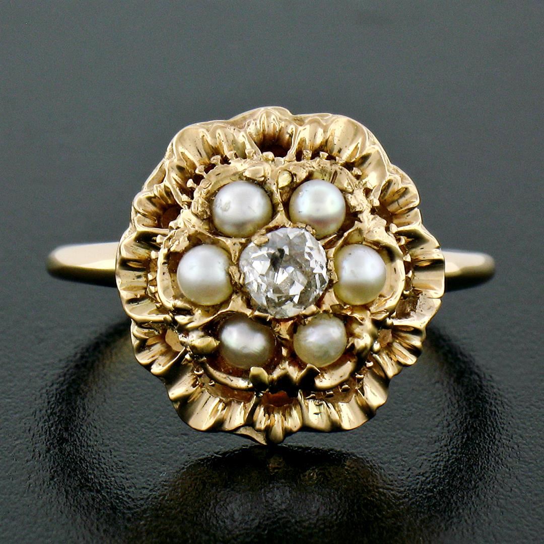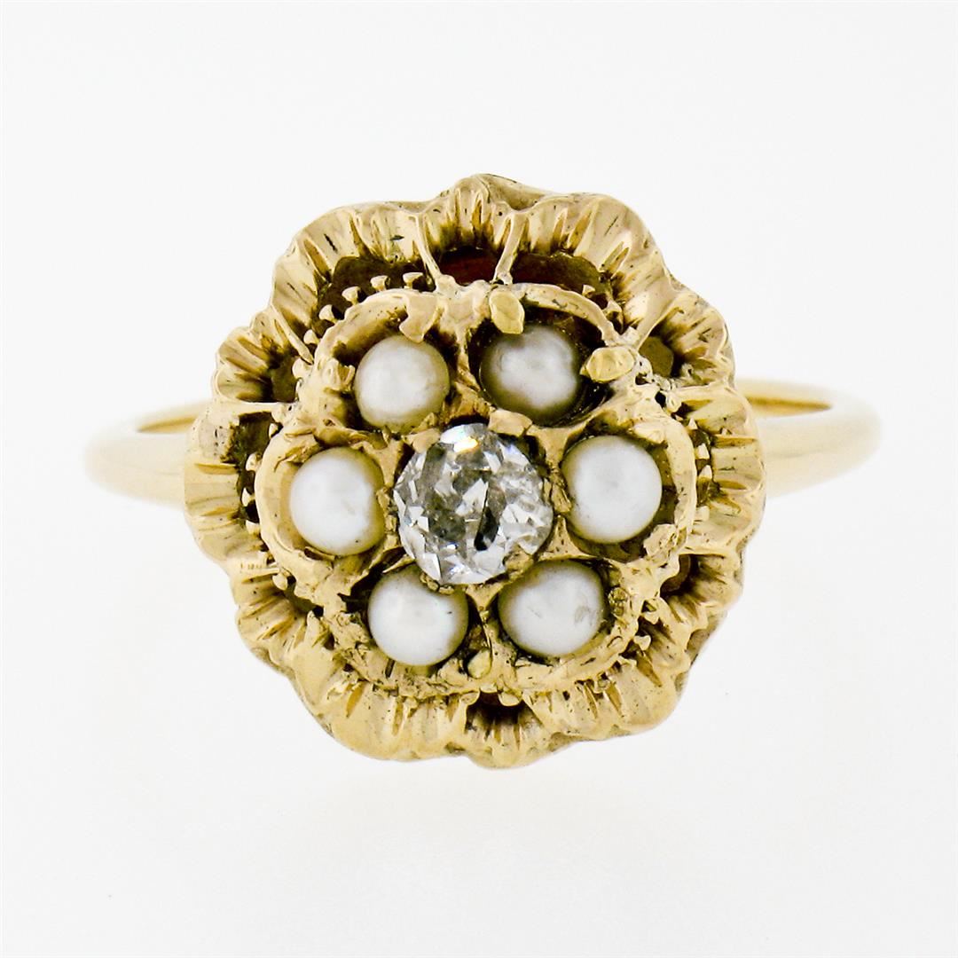 A vintage solid 14k yellow gold tiered ring, with 1 old european cut natural diamond (F - I1 ; 0.21ct), surrounded with 6 round shape natural seed pearls ( 2.6mm). The ring is size 8.0, weighs a total of 4.29 grams, and measures 15.0mm wide.