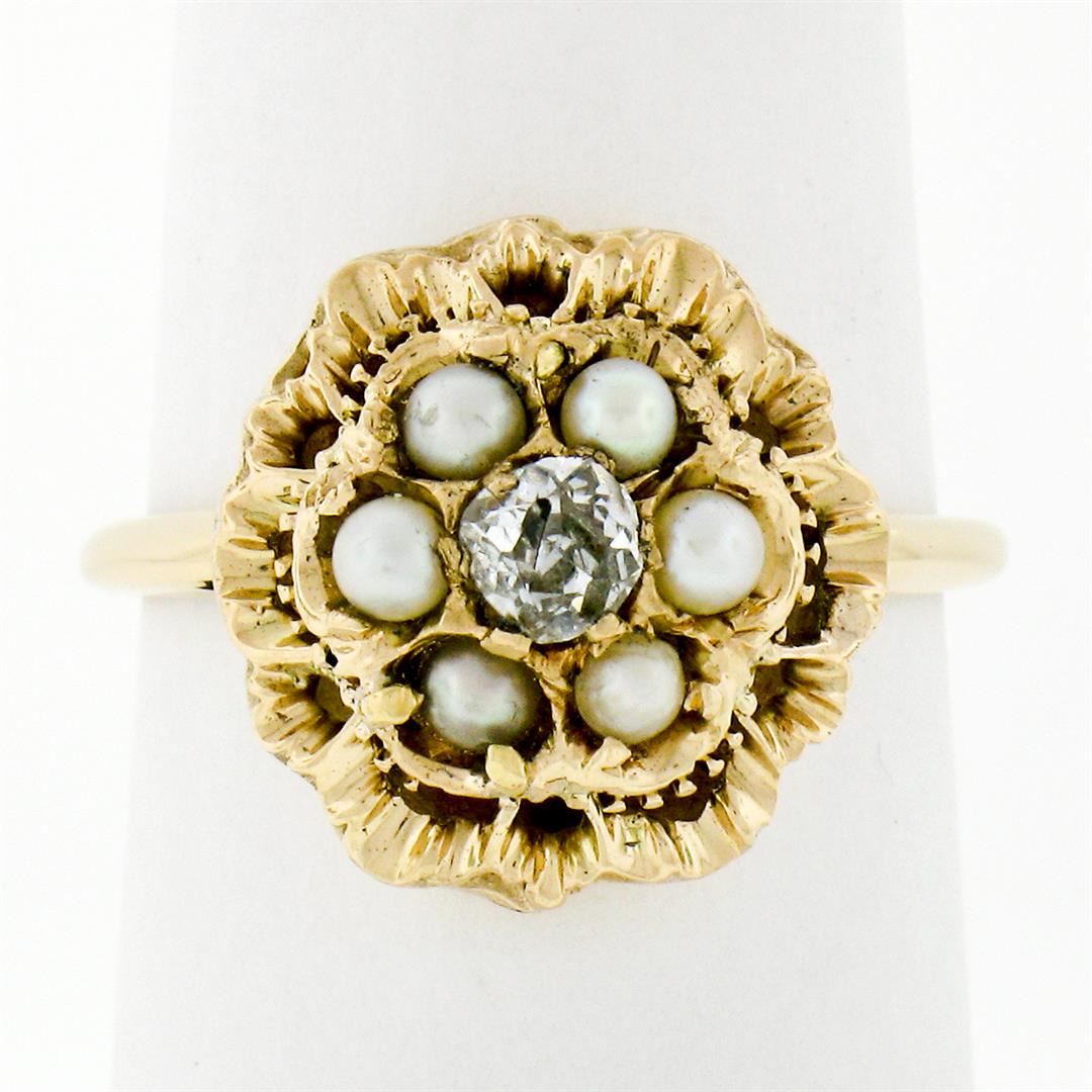 A vintage solid 14k yellow gold tiered ring, with 1 old european cut natural diamond (F - I1 ; 0.21ct), surrounded with 6 round shape natural seed pearls ( 2.6mm). The ring is size 8.0, weighs a total of 4.29 grams, and measures 15.0mm wide.