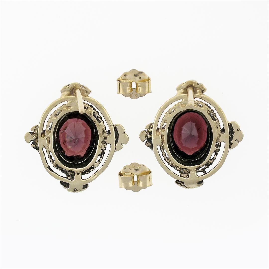 Vintage 14k Yellow Gold 3.20 ctw Oval Garnet Flower Open Work Frame Stud Earring