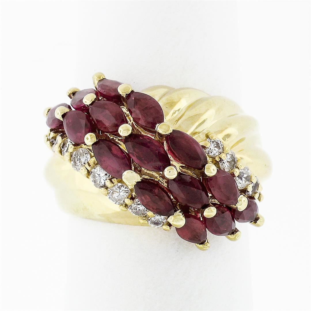 A vintage solid 14k yellow gold ring, with 15 marquise cur natural rubies (3.00ctw ), and 14 round brilliant cut natural diamonds (F/G - VS2/SI1 ; 0.32ctw). The ring is size 4.5, weighs a total of 5.53 grams, and measures 14.80mm wide.