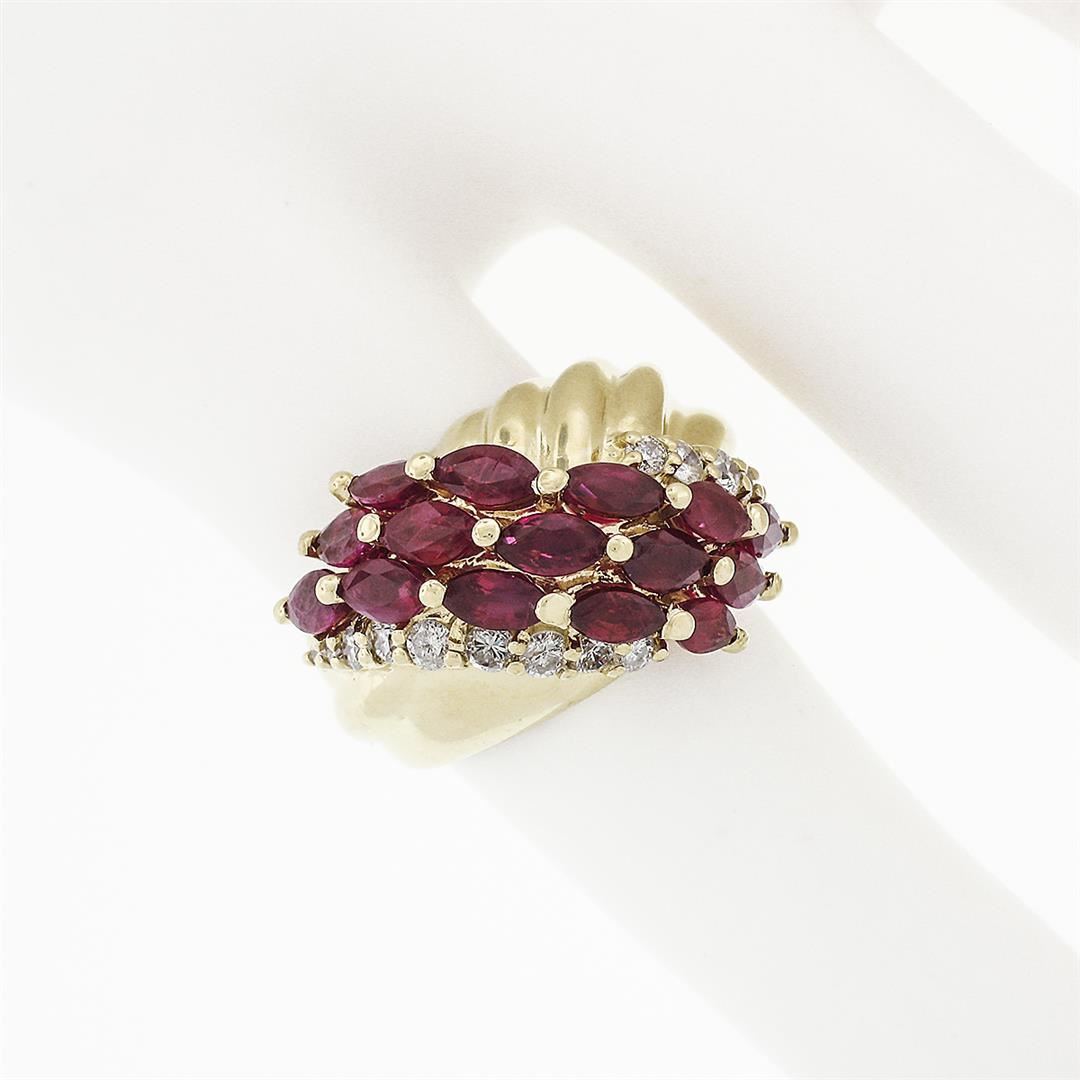 A vintage solid 14k yellow gold ring, with 15 marquise cur natural rubies (3.00ctw ), and 14 round brilliant cut natural diamonds (F/G - VS2/SI1 ; 0.32ctw). The ring is size 4.5, weighs a total of 5.53 grams, and measures 14.80mm wide.