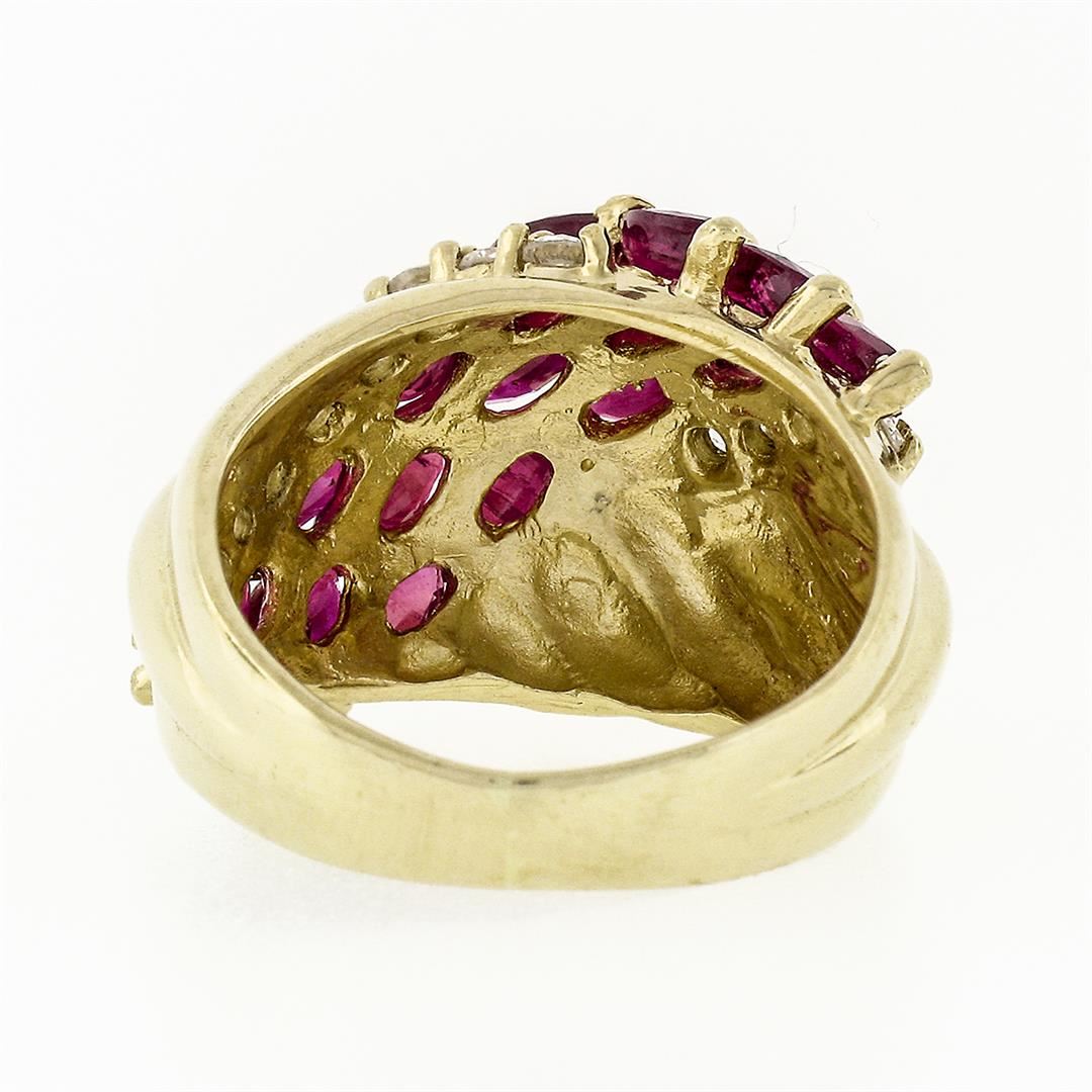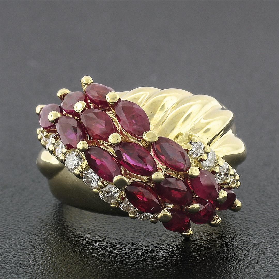 A vintage solid 14k yellow gold ring, with 15 marquise cur natural rubies (3.00ctw ), and 14 round brilliant cut natural diamonds (F/G - VS2/SI1 ; 0.32ctw). The ring is size 4.5, weighs a total of 5.53 grams, and measures 14.80mm wide.