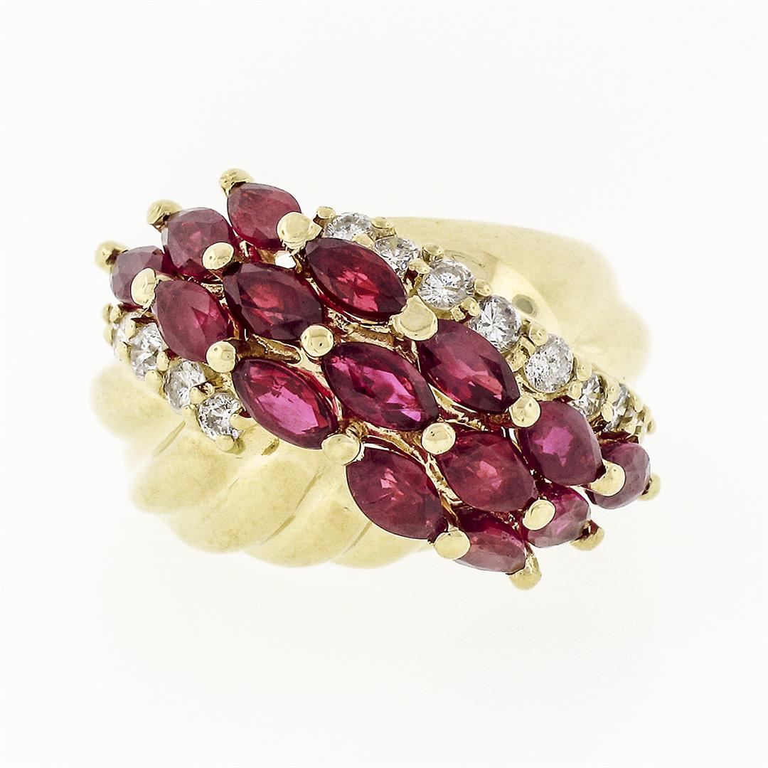 A vintage solid 14k yellow gold ring, with 15 marquise cur natural rubies (3.00ctw ), and 14 round brilliant cut natural diamonds (F/G - VS2/SI1 ; 0.32ctw). The ring is size 4.5, weighs a total of 5.53 grams, and measures 14.80mm wide.