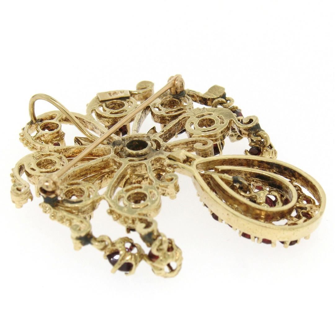 One Vintage 14k Yellow Gold 6.75ctw Round Garnet Open Work Dangle Pin Brooch Pendant. Item Details: Material: 14K Solid Yellow Gold, Total Weight: 18.51 Grams, Stone(s): (28) Natural Genuine Garnets - Round Cut - Prong Set - Rich Red Colors, Total Carat Weight: 6.75 (approx.), Overall Height: 52.78mm (including the oval dangle), Overall Width: 44.60mm, Overall Thickness: 7.91mm (not including the pin), Bail Measurements (Inside): 5.30x7.97mm Clasp: Pin Back w/ Rotating Lock Mechanism Condition: Vintage piece. Original patina has been preserved. Excellent overall condition!