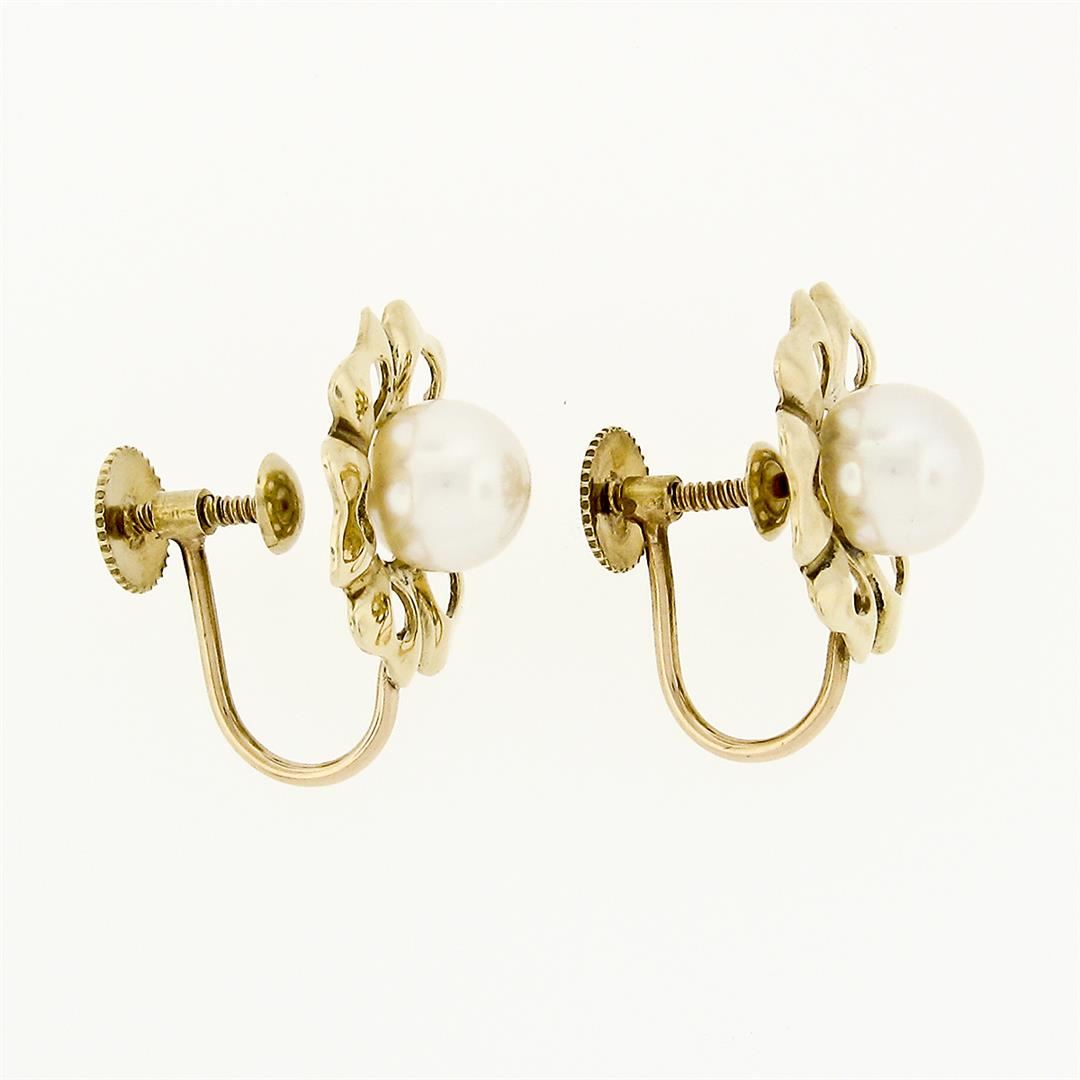 Vintage 14k Yellow Gold 6.8mm Round Pearl Open Flower Frame Screw Back Earrings