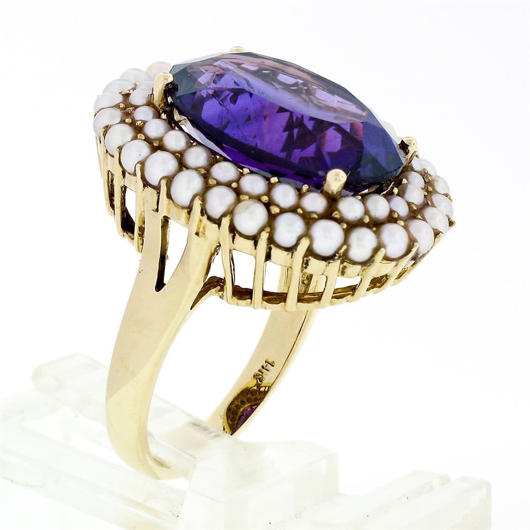 A vintage solid 14k yellow gold ring, with 1 oval cut natural amethyst (15.95x12.05mm - 7.13ct), surrounded with a halo of round shape natural seed pearls (1.75 and 2.25mm). The ring is size 7.0, weighs a total of 9.84 grams, and measures 23.81mm wide.